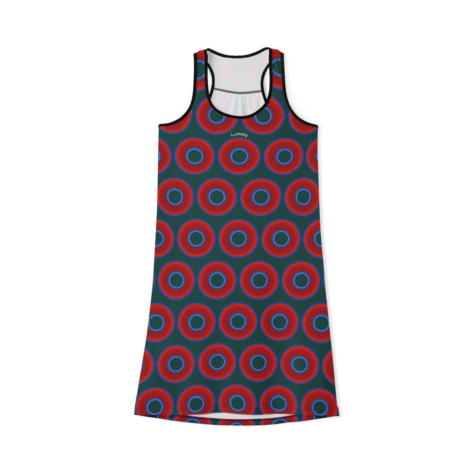 Tela's Lumpy Racerback Donut Dress - red vivid donut print w/dark Fenway green background