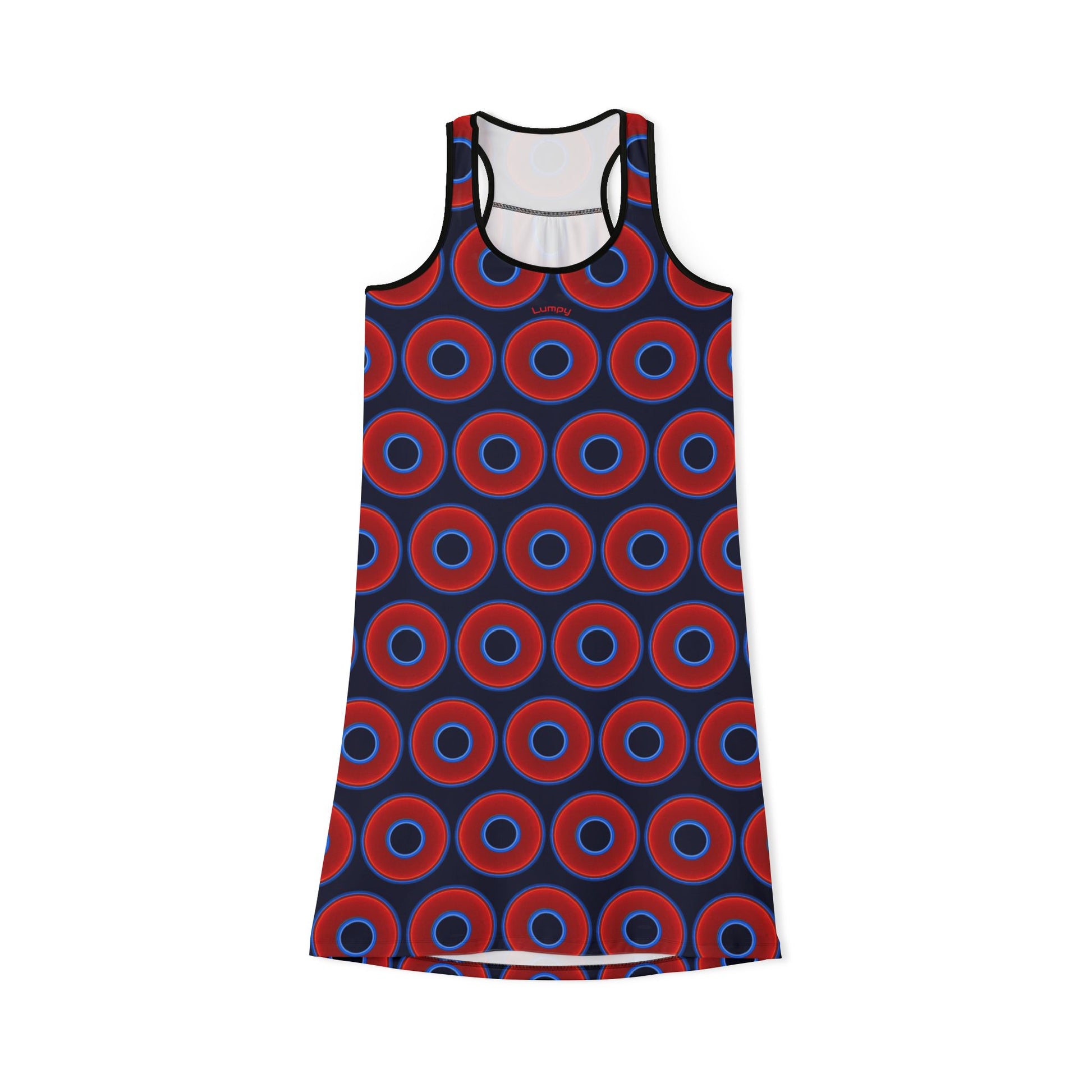 Tela's Lumpy Racerback Donut Dress - red vivid donut print w/dark navy blue background