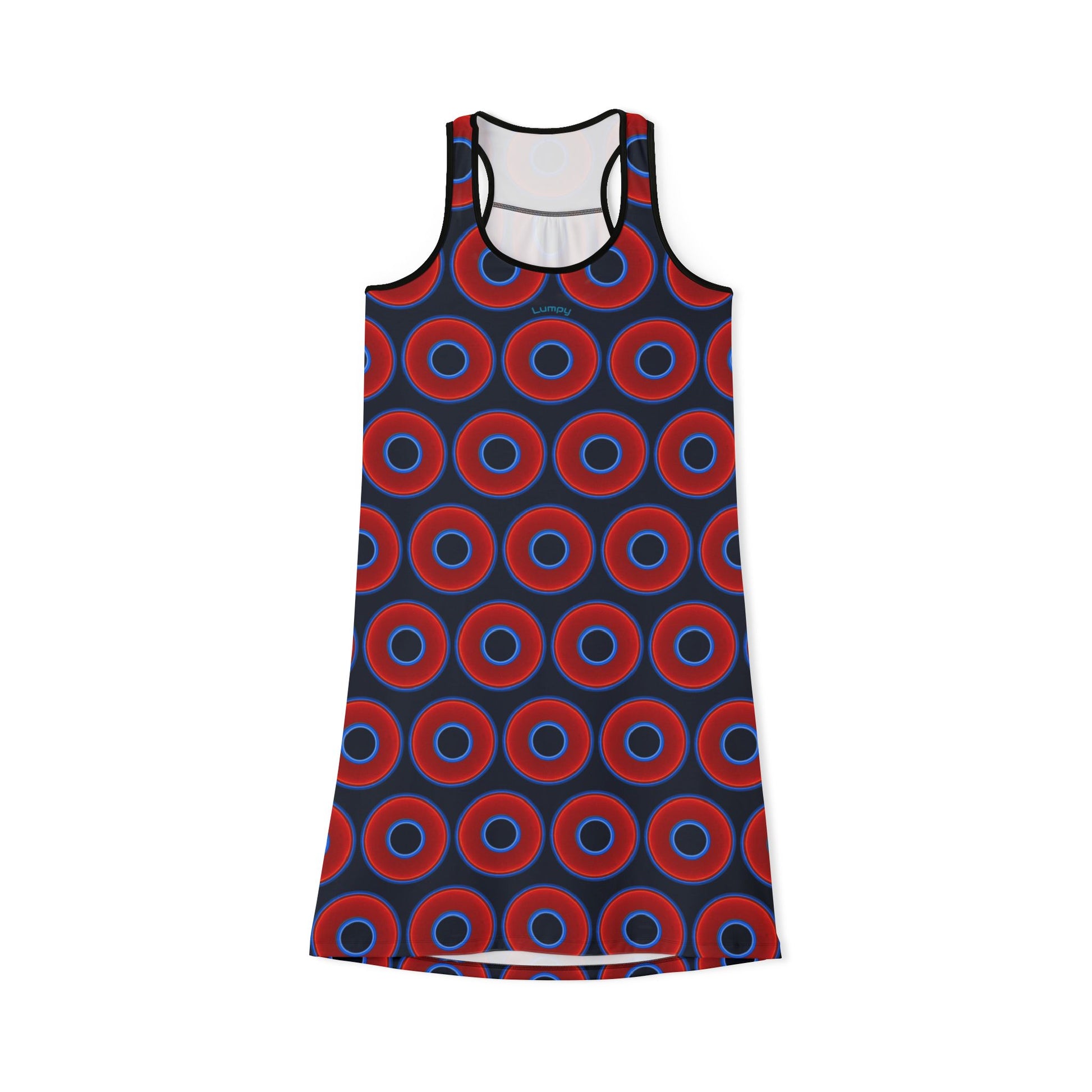 Tela's Lumpy Racerback Donut Dress - red vivid donut print w/dark teal blue elite background