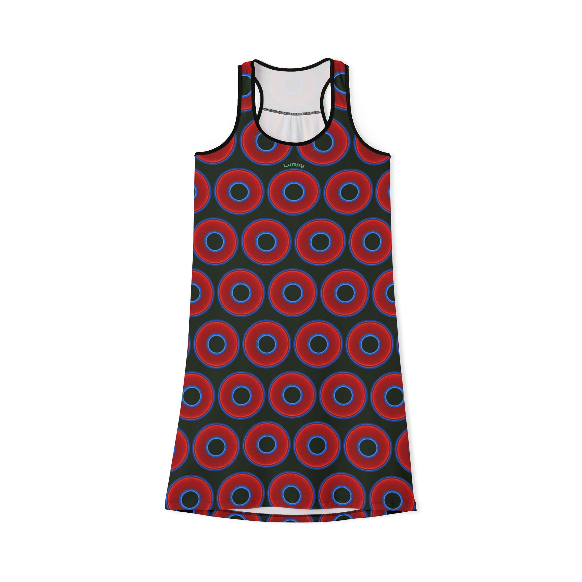 Tela's Lumpy Racerback Donut Dress - red vivid donut print w/deep forest green background