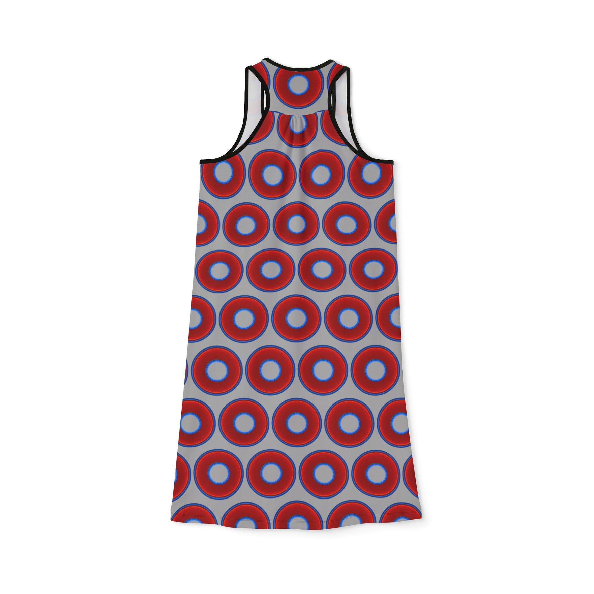 Tela's Lumpy Racerback Donut Dress - red vivid donut print w/light gray background