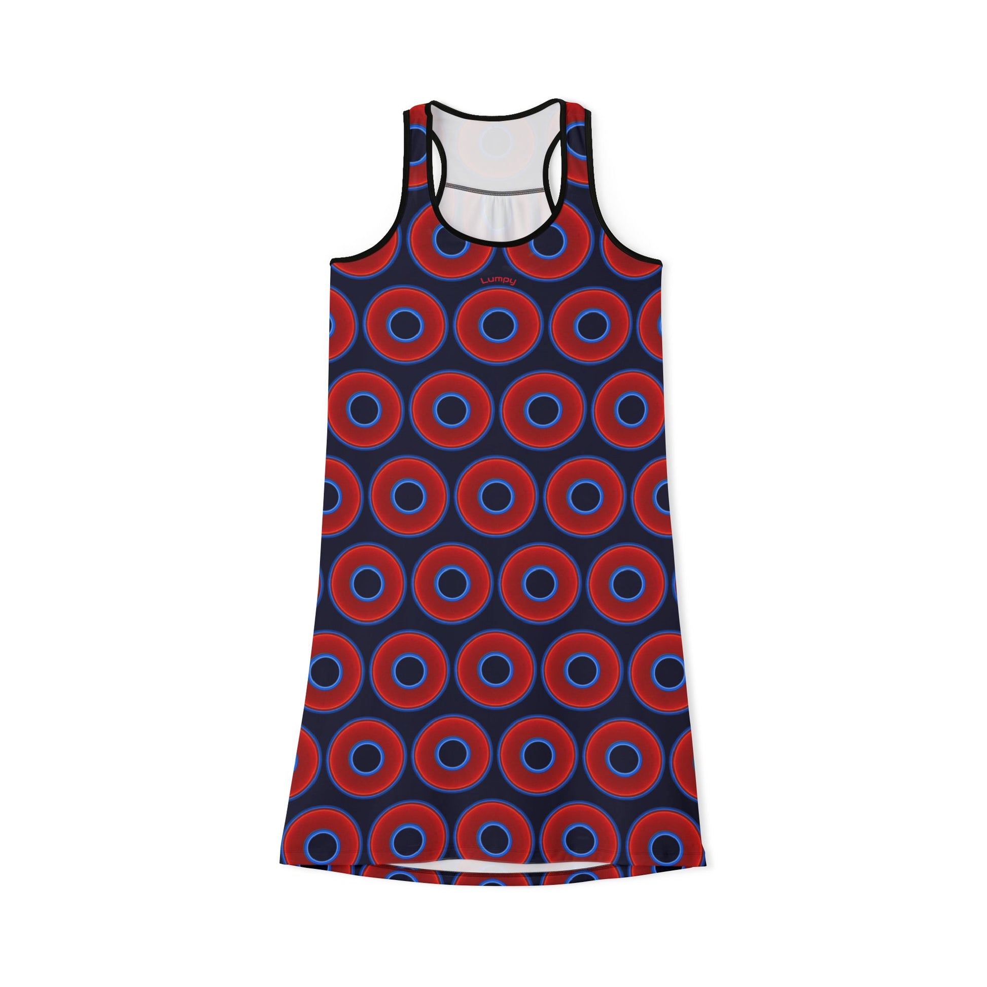 Tela's Lumpy Racerback Donut Dress - red vivid donut print w/midnight blue background