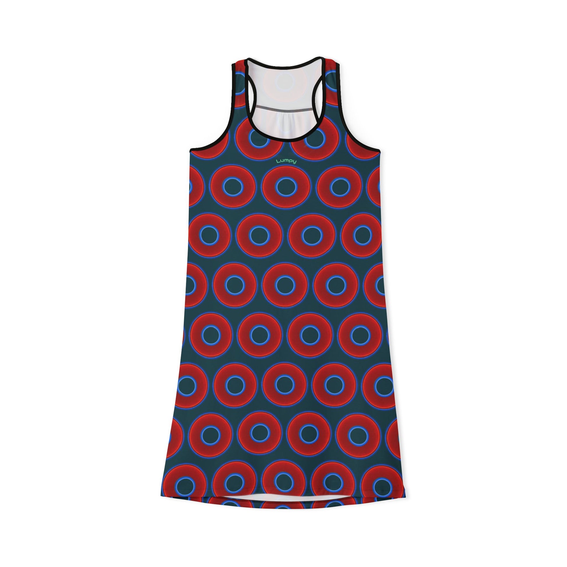 Tela's Lumpy Racerback Donut Dress - red vivid donut print w/midnight teel green background