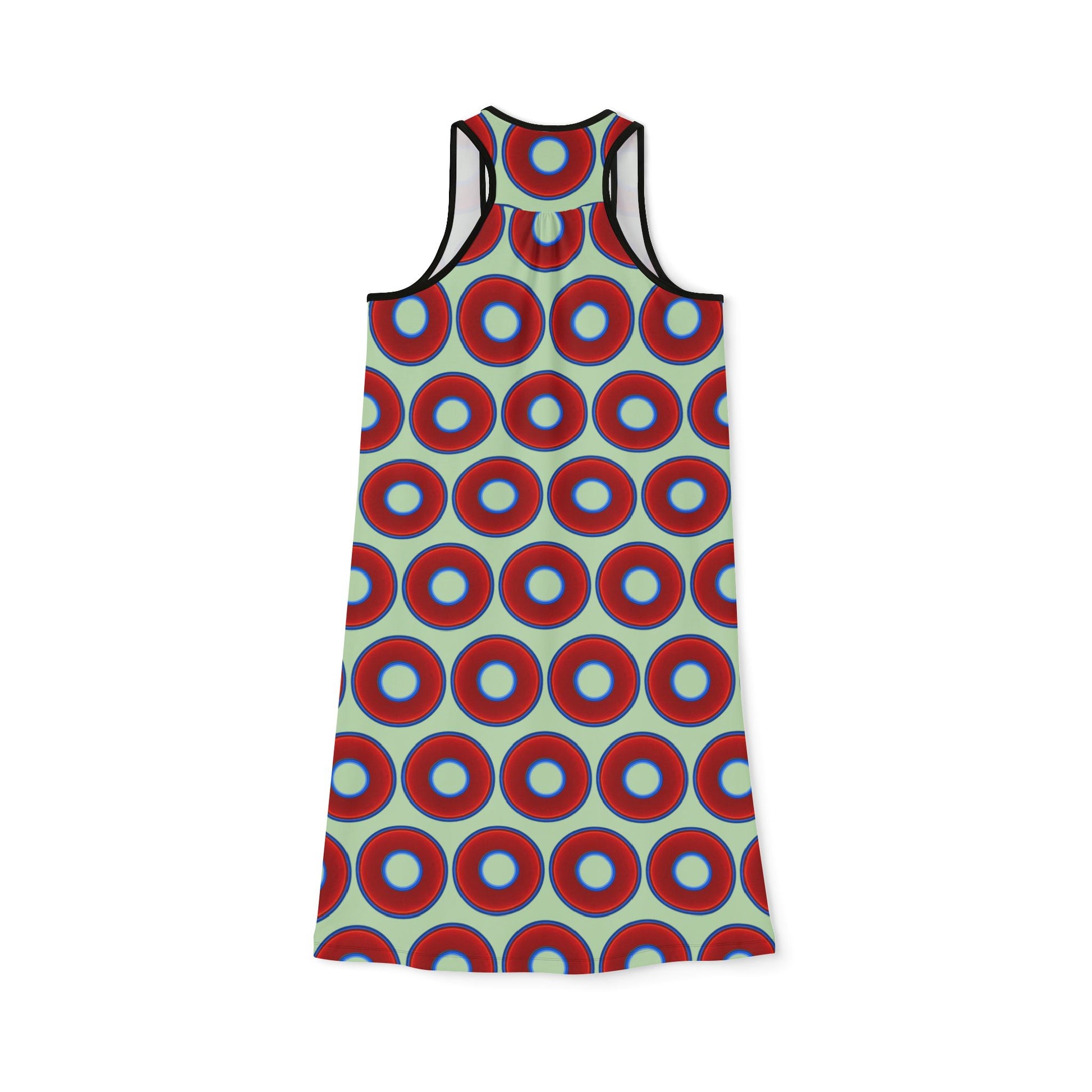 Tela's Lumpy Racerback Donut Dress - red vivid donut print w/seafoam background