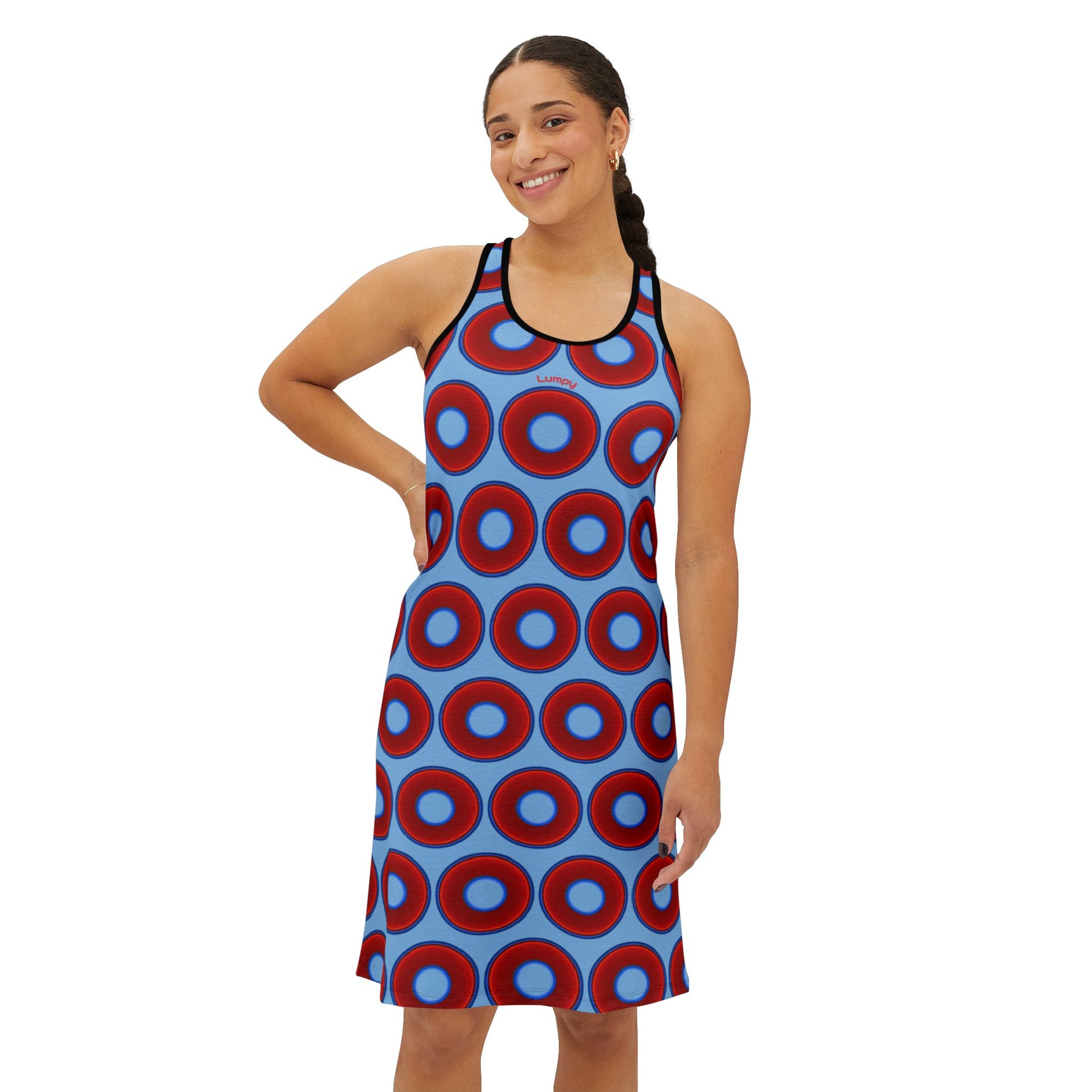 Tela's Lumpy Racerback Donut Dress - red vivid donut print w/sky blue background