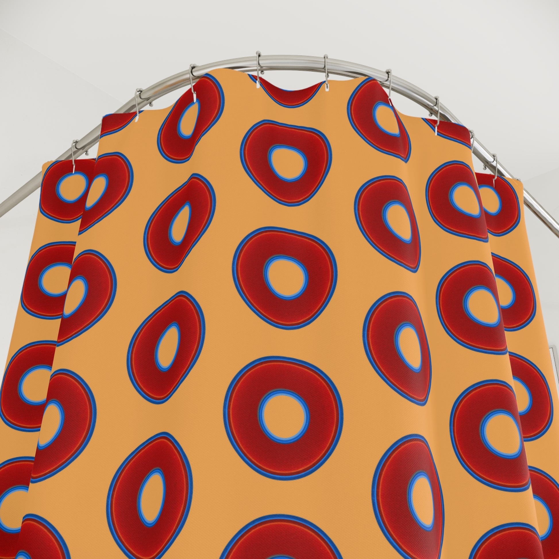 The Curtain With "Donuts" - Lumpy Bath Time Fun - vivid red donuts w/creamsicle orange background