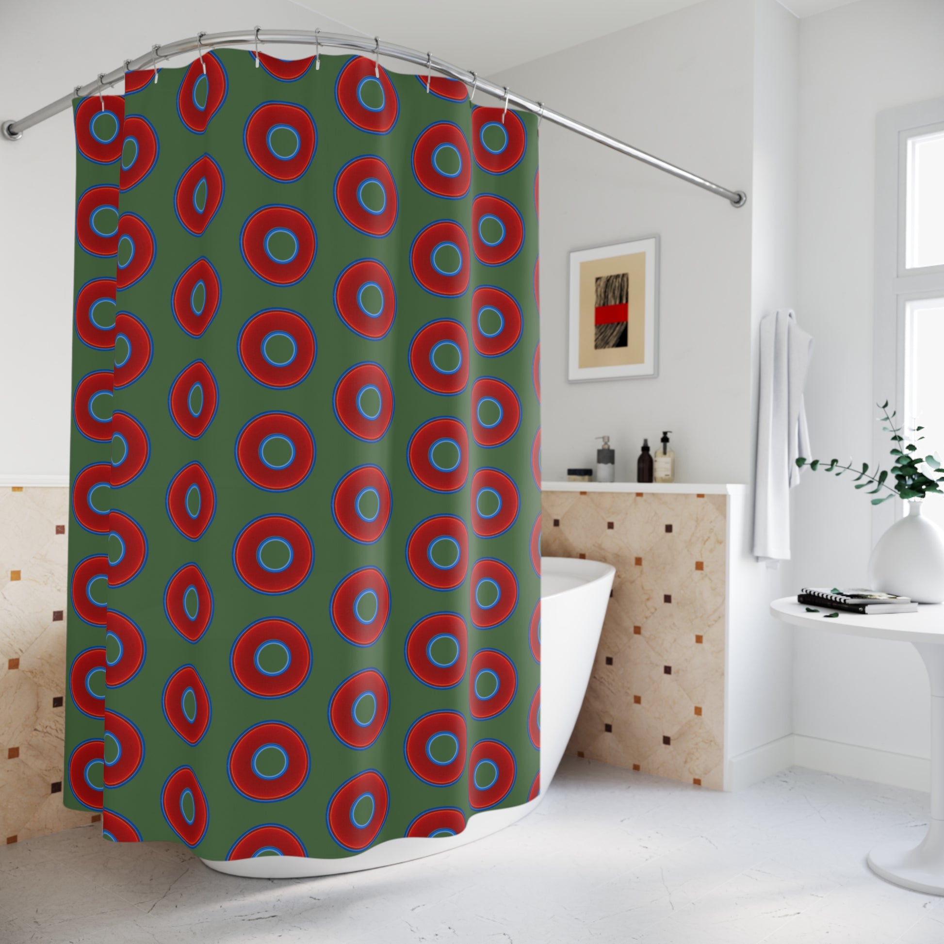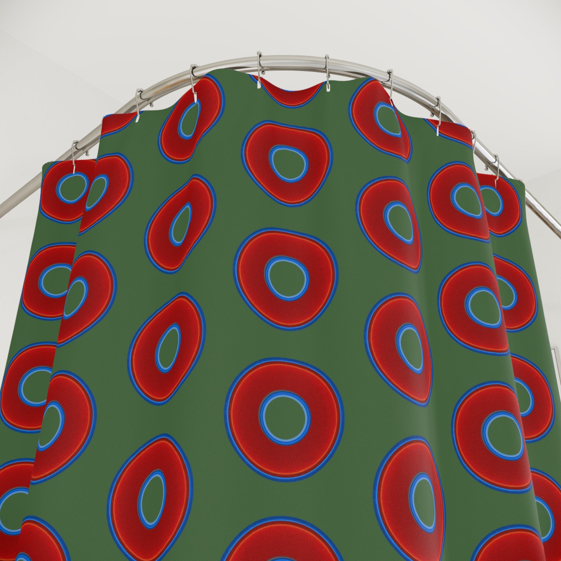 The Curtain With "Donuts" - Lumpy Bath Time Fun - vivid red donuts w/dark green background