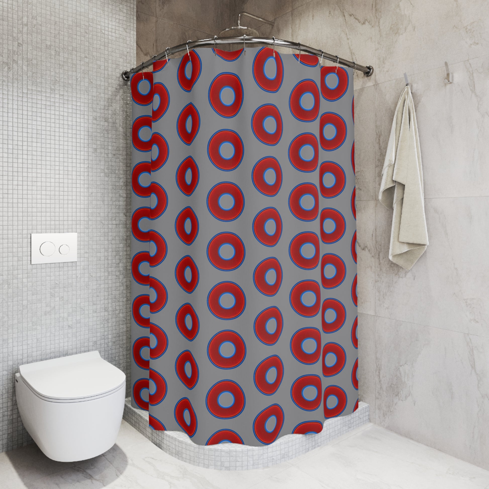 The Curtain With "Donuts" - Lumpy Bath Time Fun - vivid red donuts w/gray background