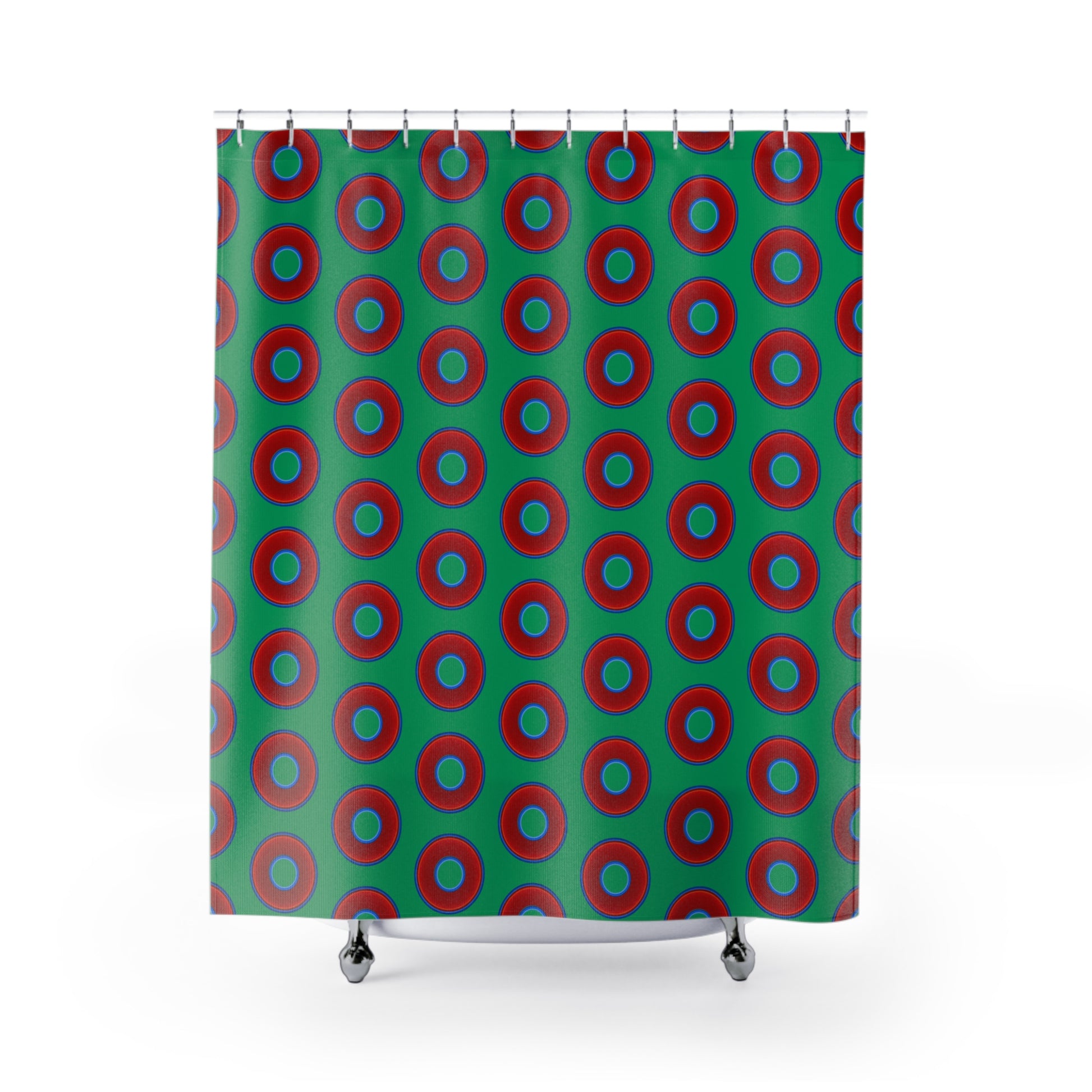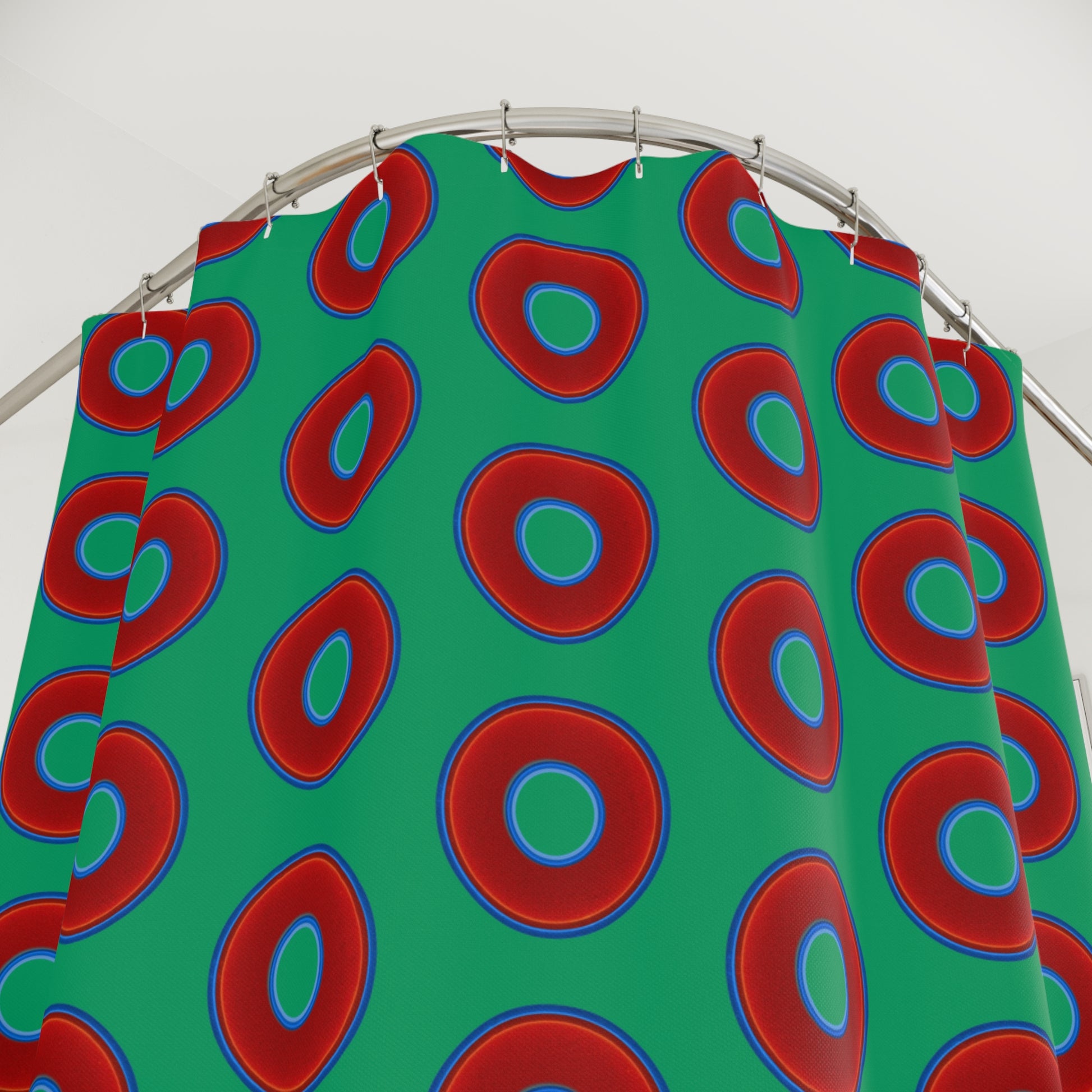 The Curtain With "Donuts" - Lumpy Bath Time Fun - vivid red donuts w/jade green background