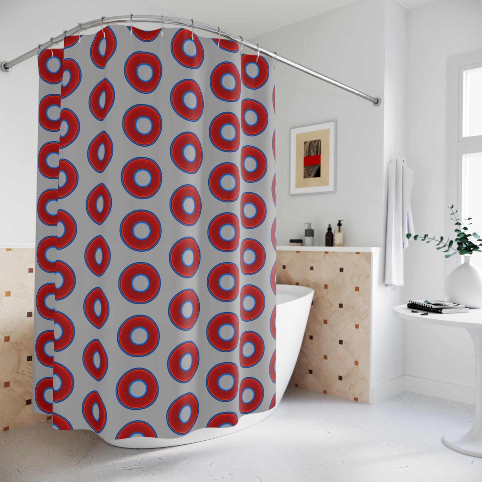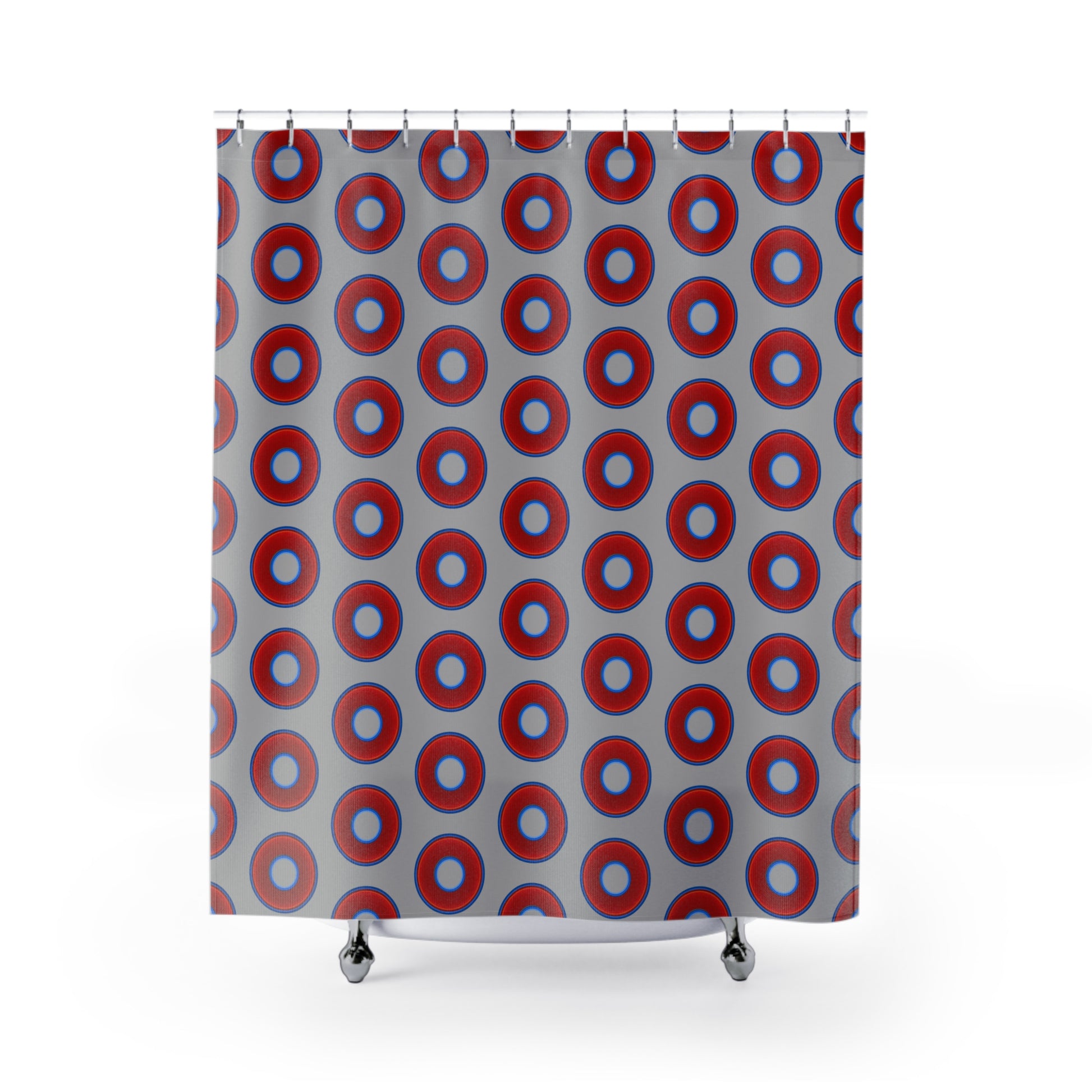 The Curtain With "Donuts" - Lumpy Bath Time Fun - vivid red donuts w/light gray background