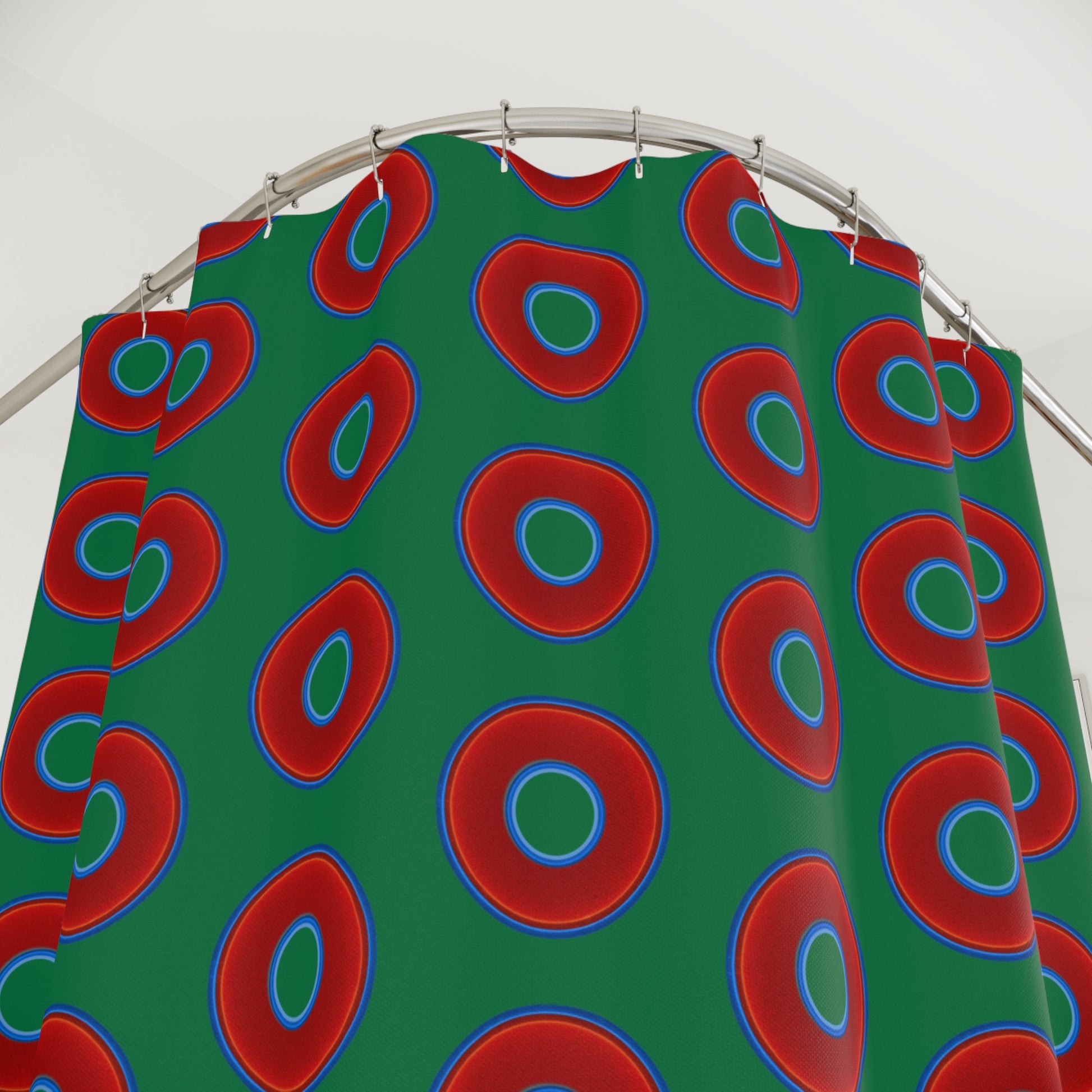 The Curtain With "Donuts" - Lumpy Bath Time Fun - vivid red donuts w/green background