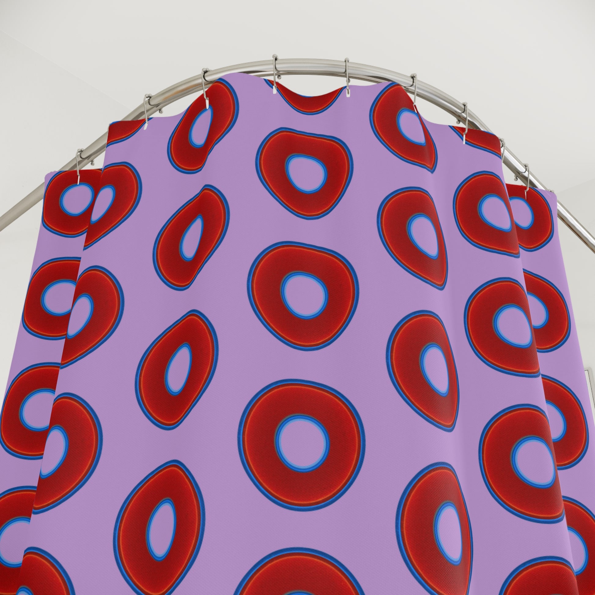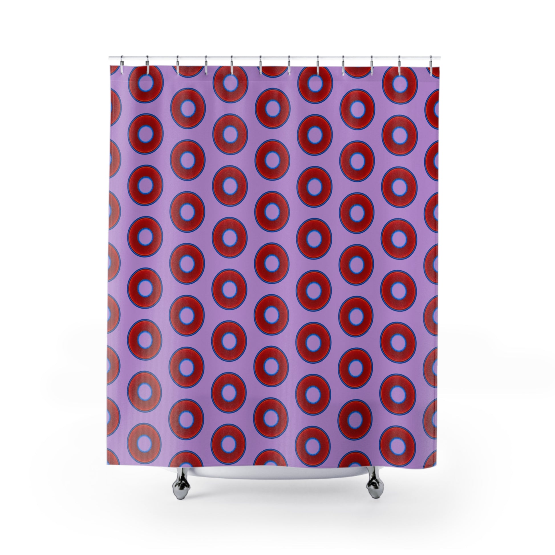 The Curtain With "Donuts" - Lumpy Bath Time Fun - vivid red donuts w/wisteria purple background