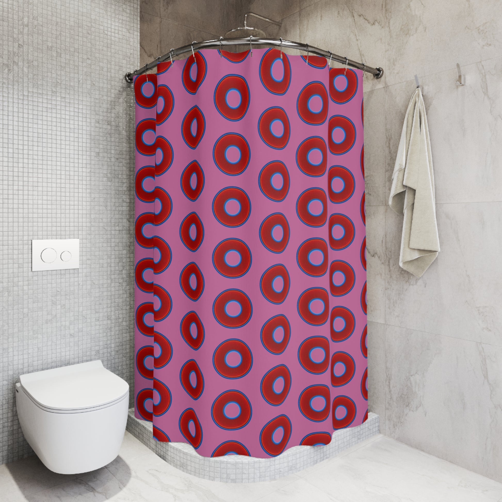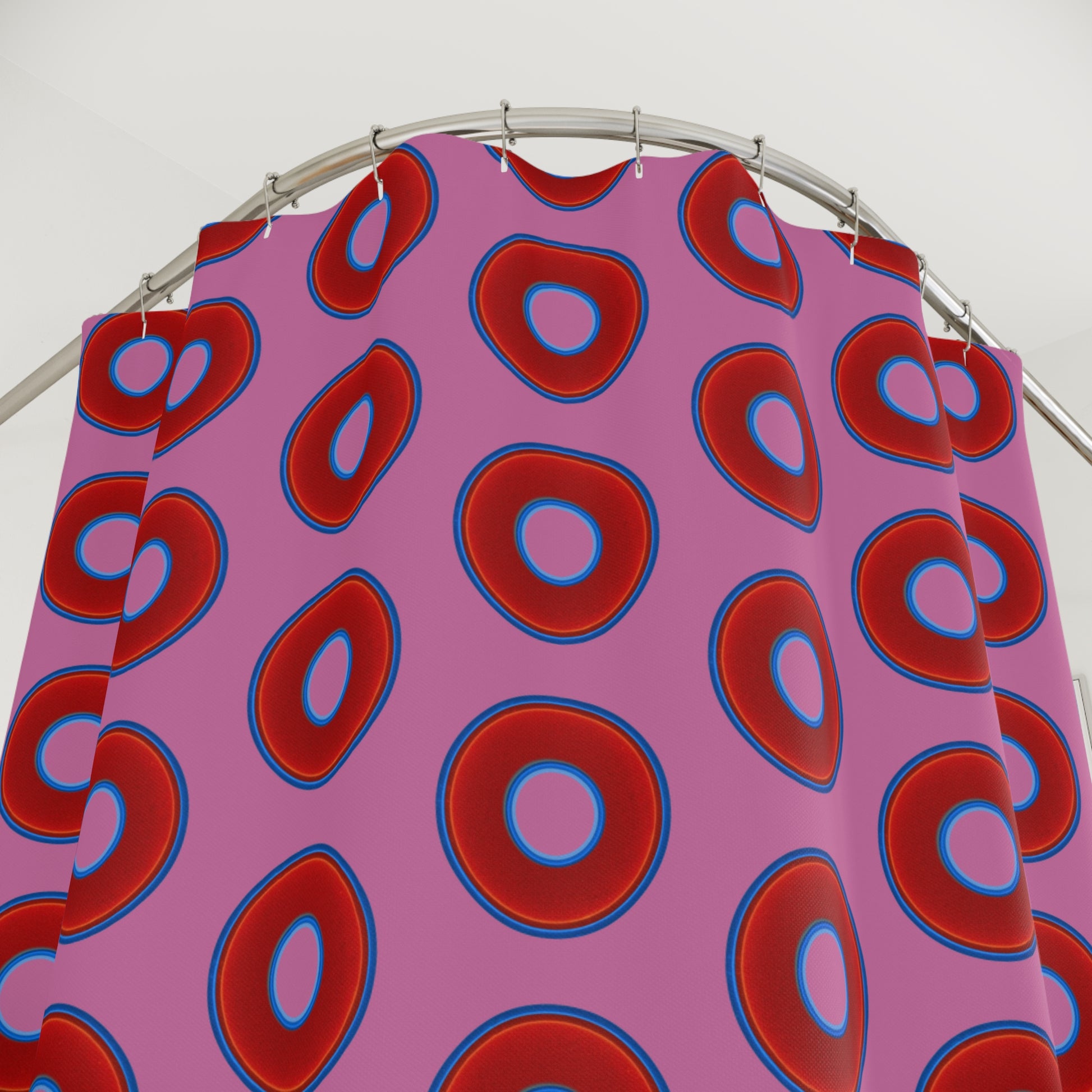 The Curtain With "Donuts" - Lumpy Bath Time Fun - vivid red donuts w/pink background