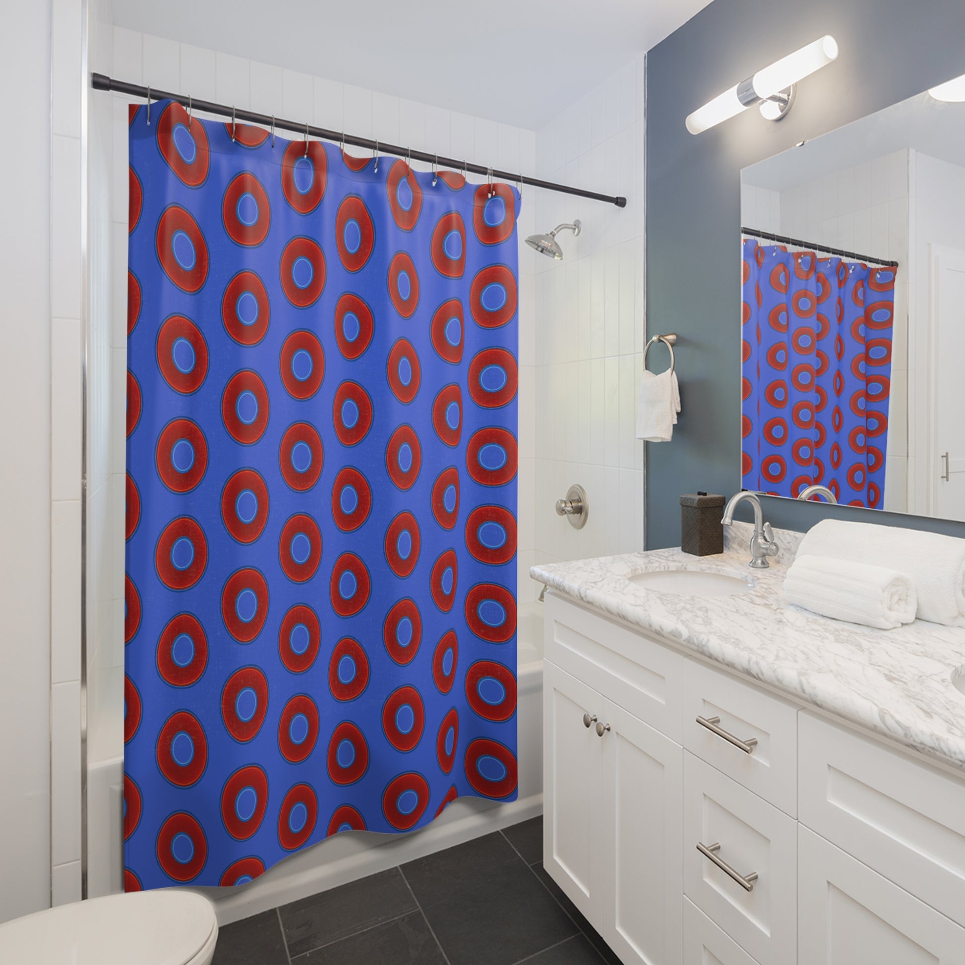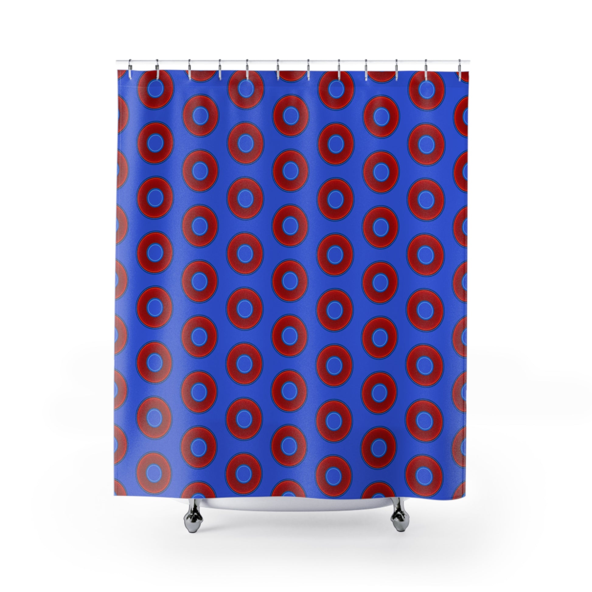 The Curtain With "Donuts" - Lumpy Bath Time Fun - vivid red donuts w/royal blue background