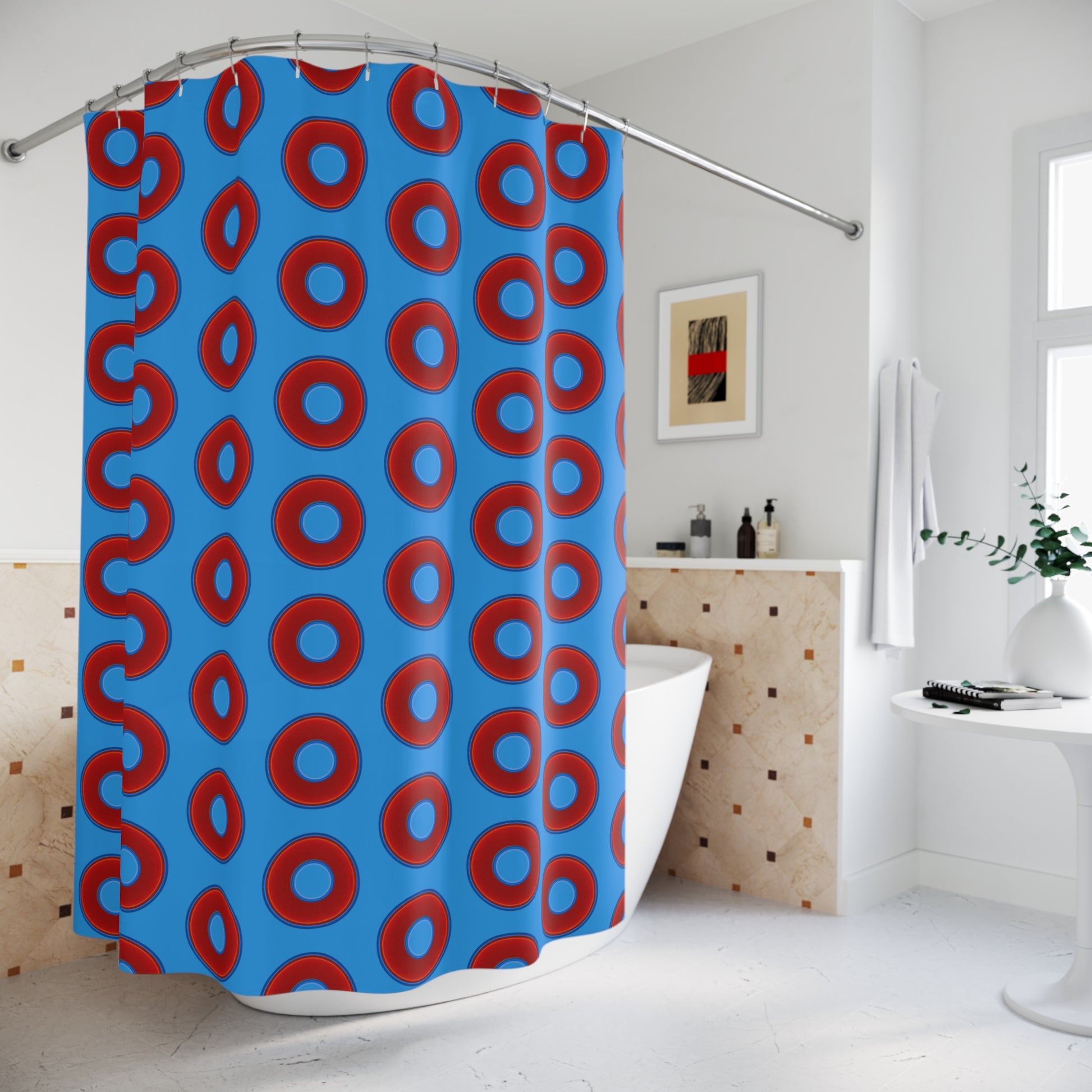 The Curtain With "Donuts" - Lumpy Bath Time Fun - vivid red donuts w/sky royal blue background