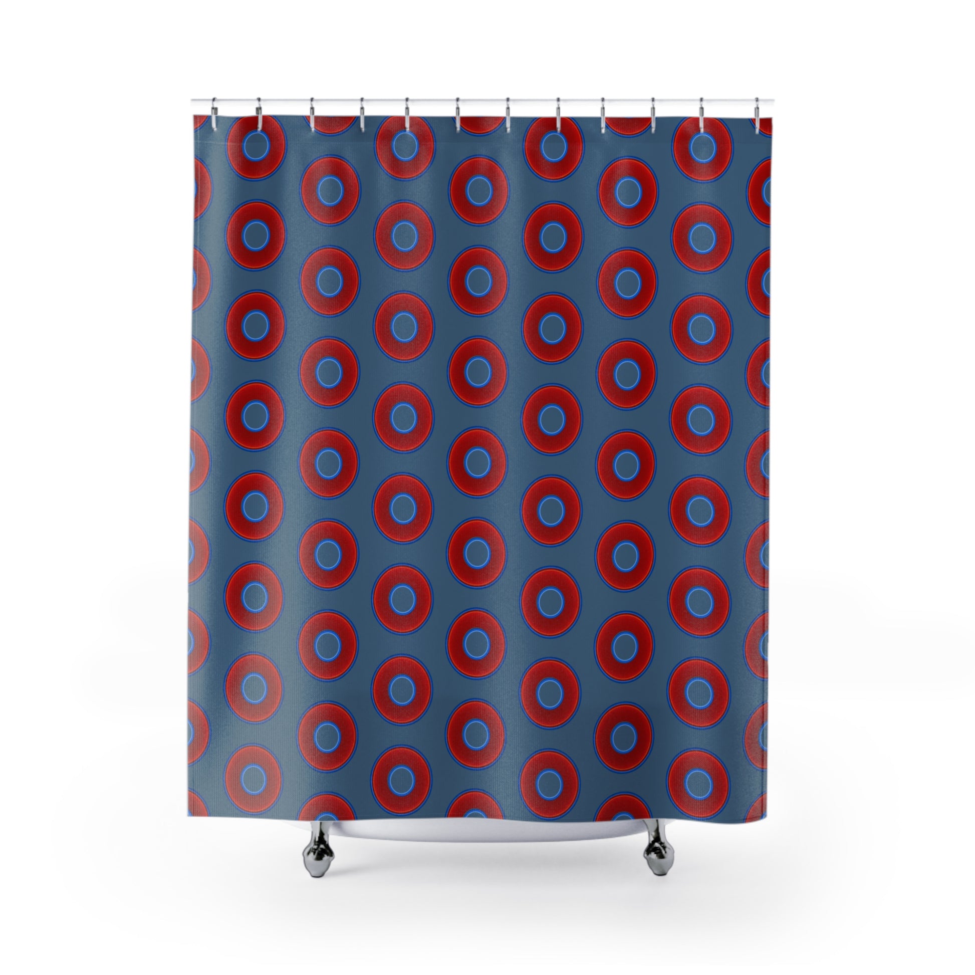 The Curtain With "Donuts" - Lumpy Bath Time Fun - vivid red donuts w/steel blue background
