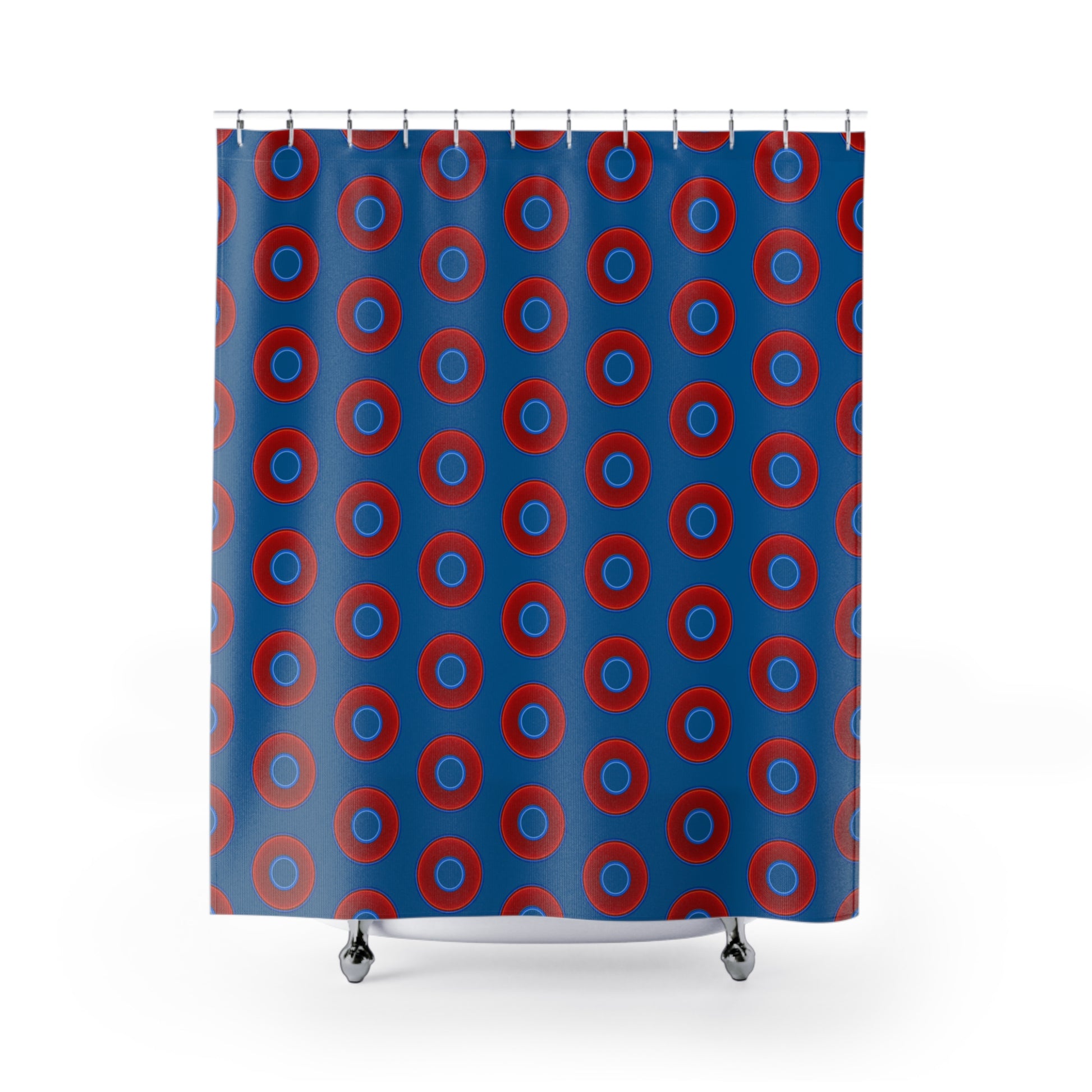 The Curtain With "Donuts" - Lumpy Bath Time Fun - vivid red donuts w/wavy navy background
