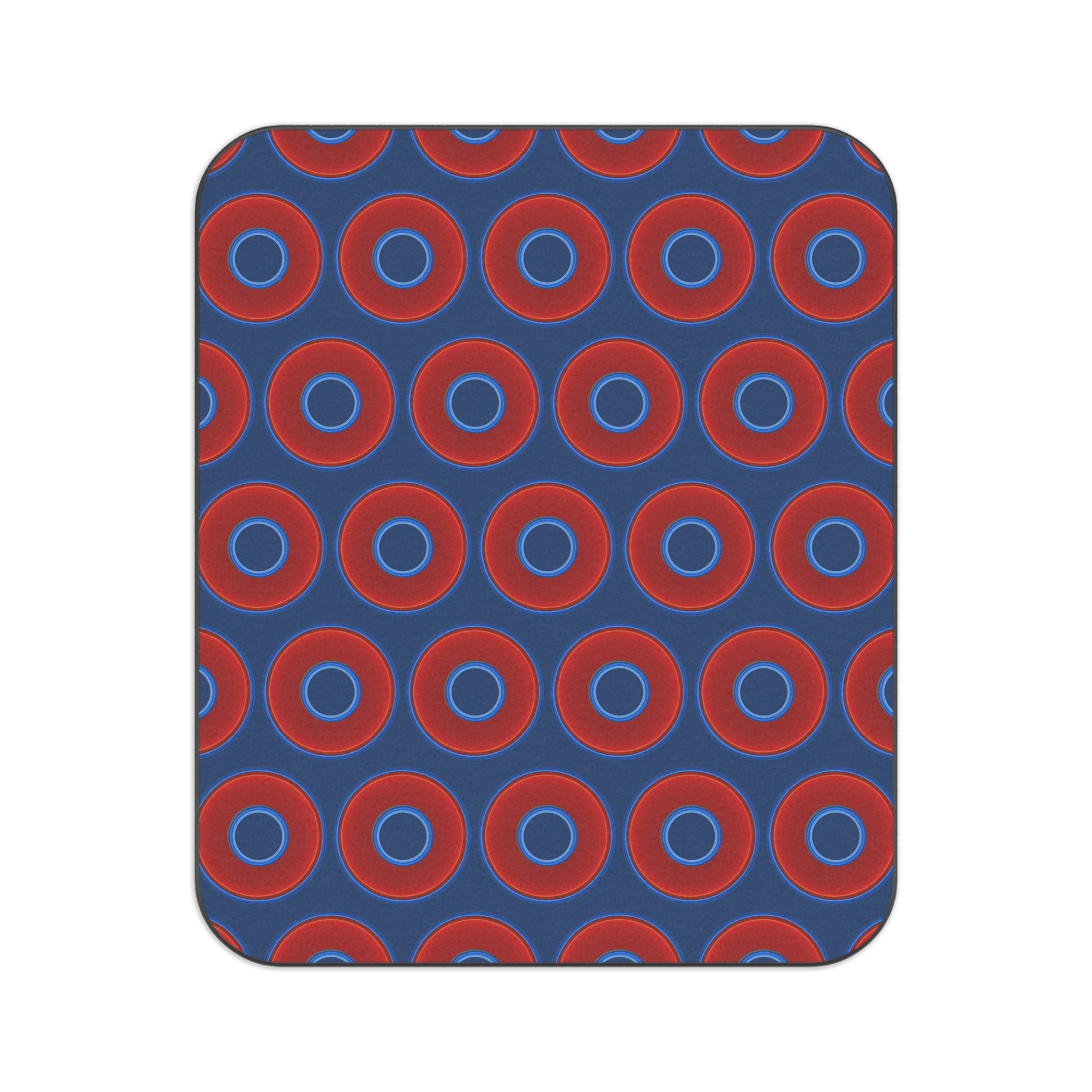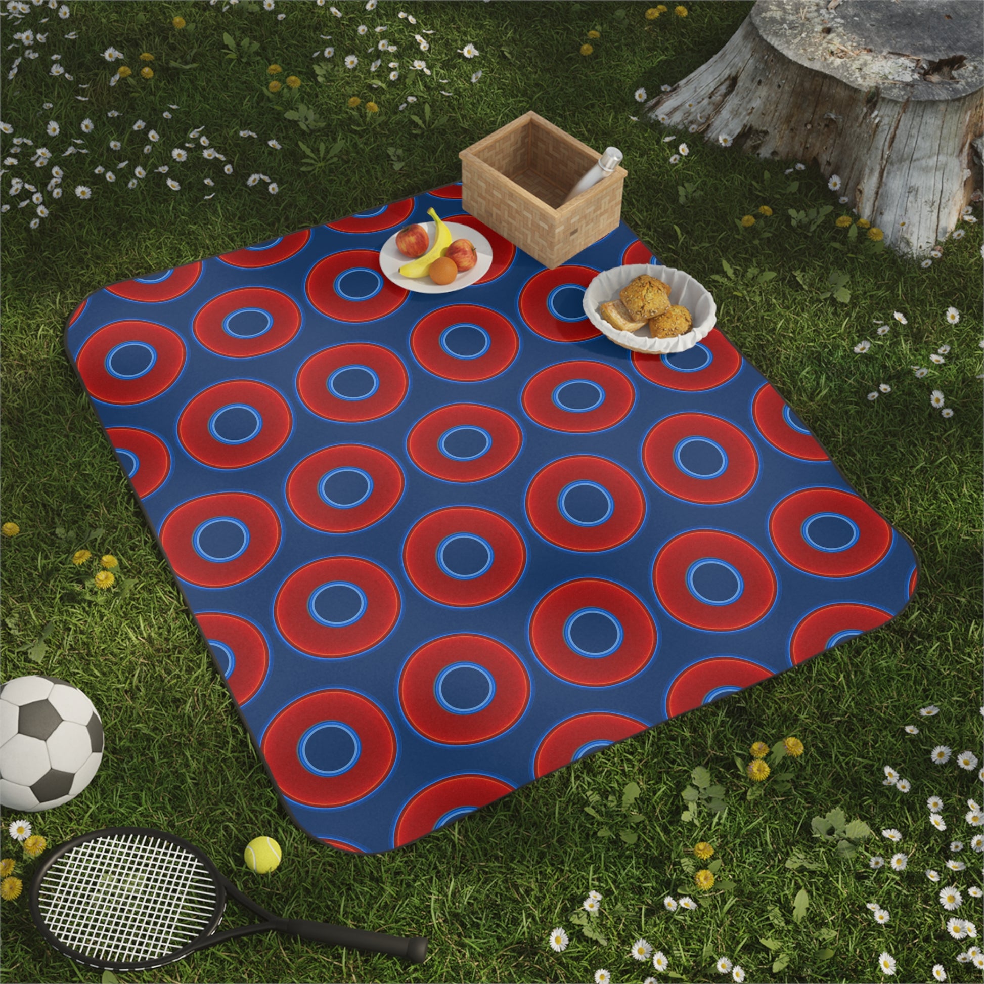 The Lumpy Party Blanket - giant water-resistant outdoor blanket [61" x 51"] - vivid red donuts w/Atlantic navy blue background