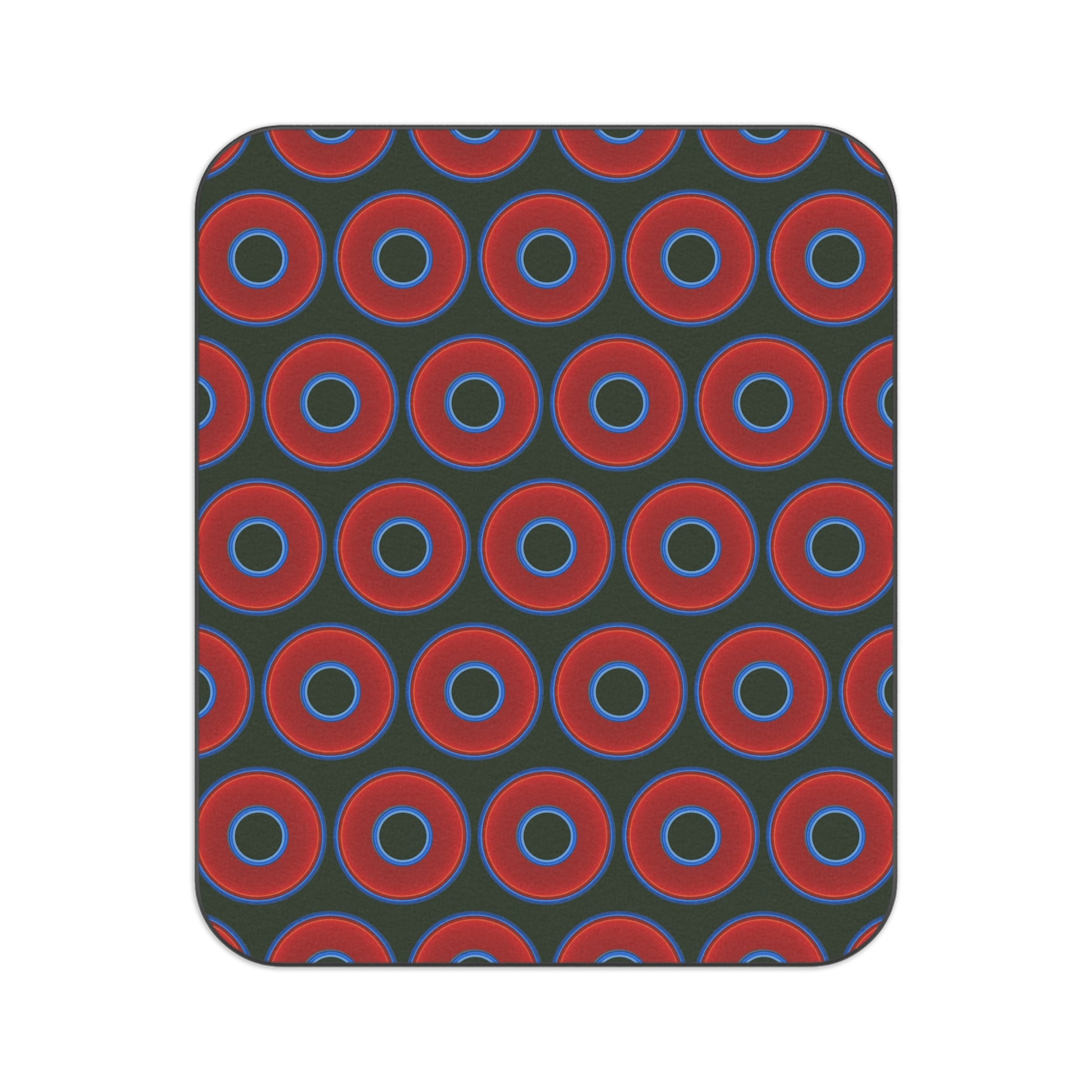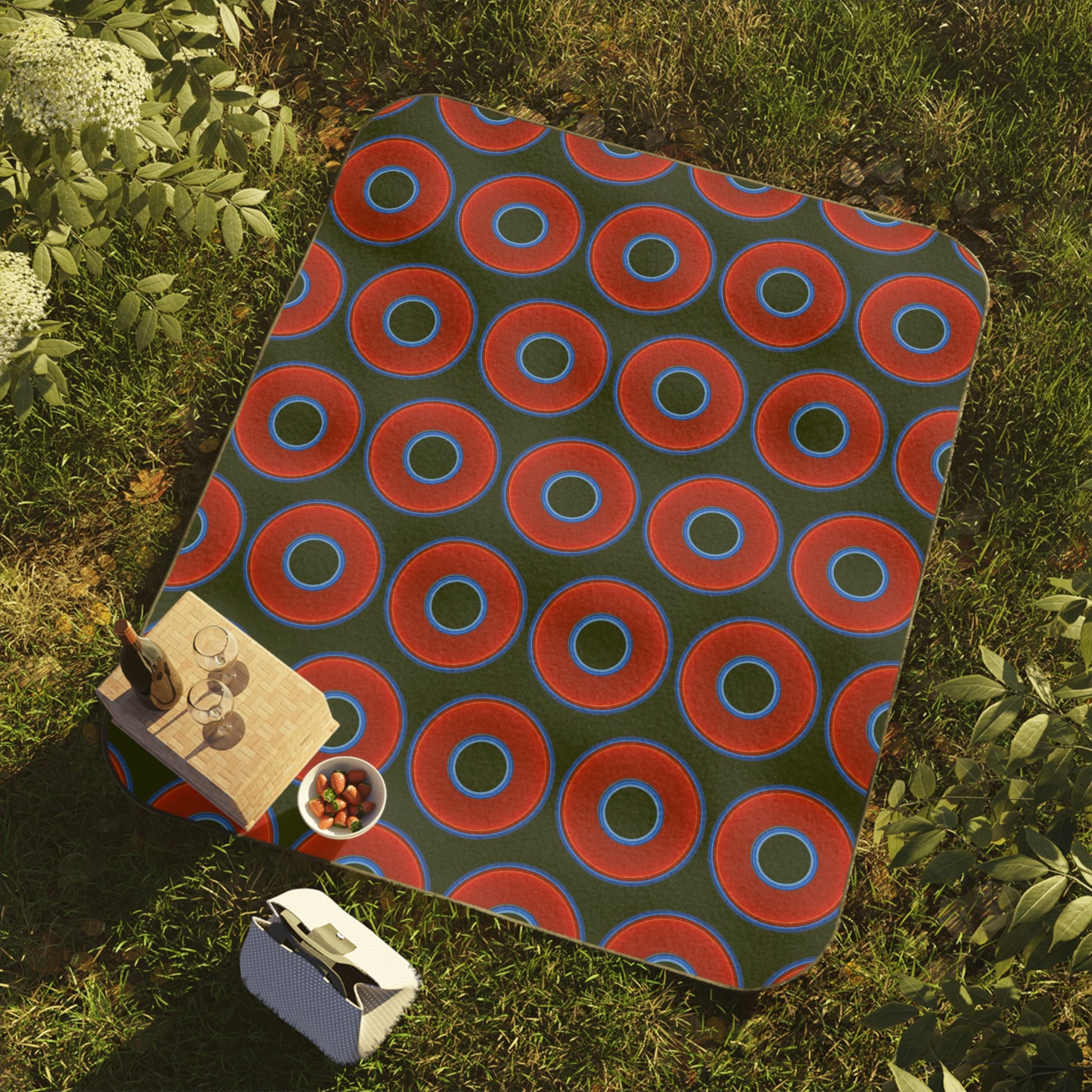 The Lumpy Party Blanket - giant water-resistant outdoor blanket [61" x 51"] - vivid red donuts w/deep forest green background