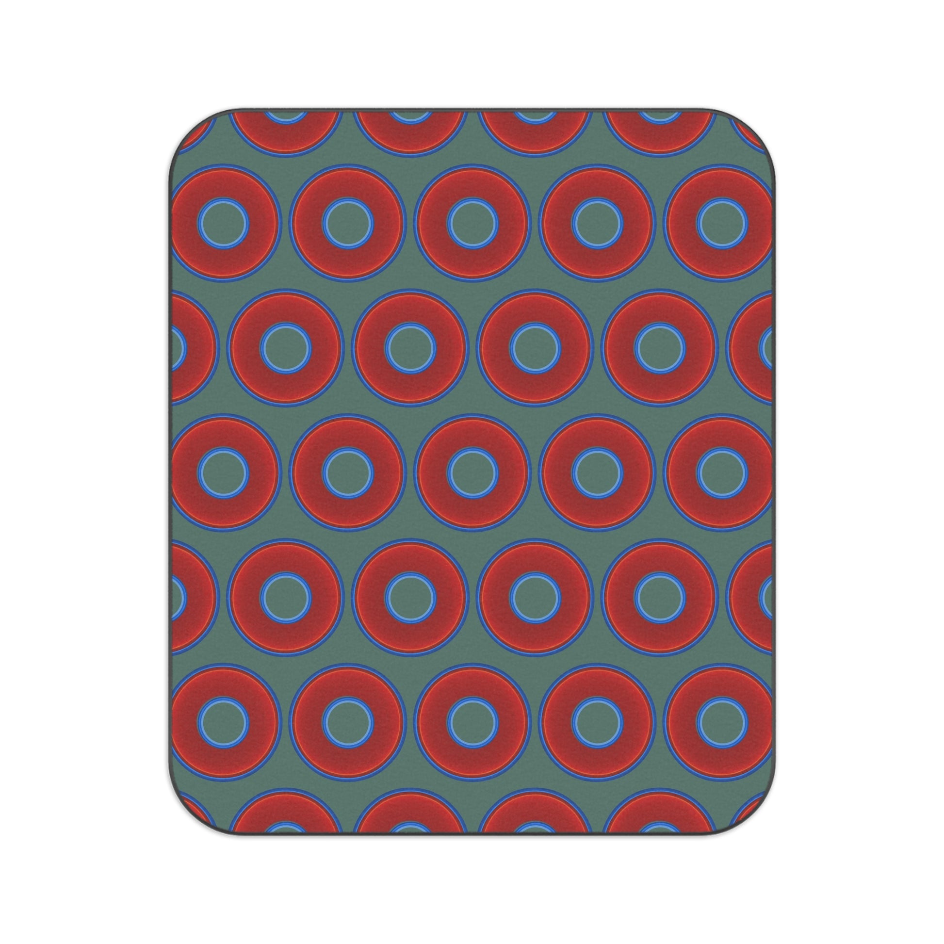 The Lumpy Party Blanket - giant water-resistant outdoor blanket [61" x 51"] - vivid red donuts w/Fenway green background