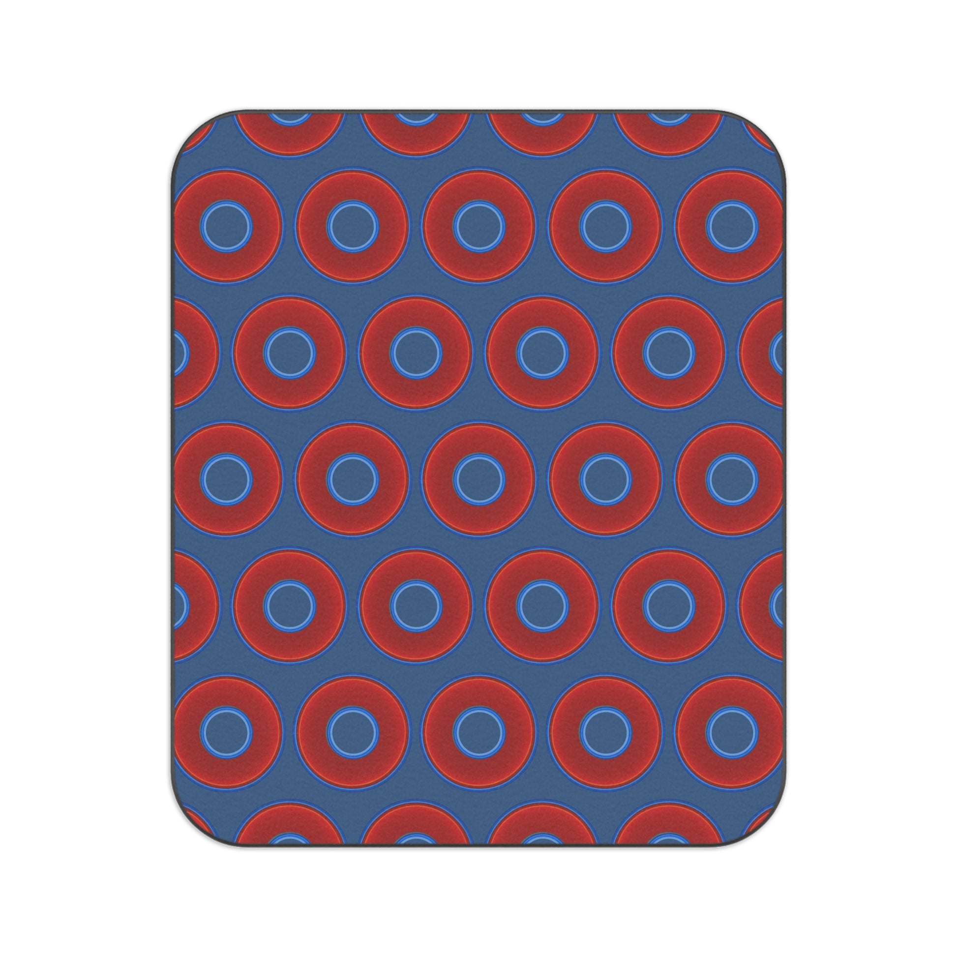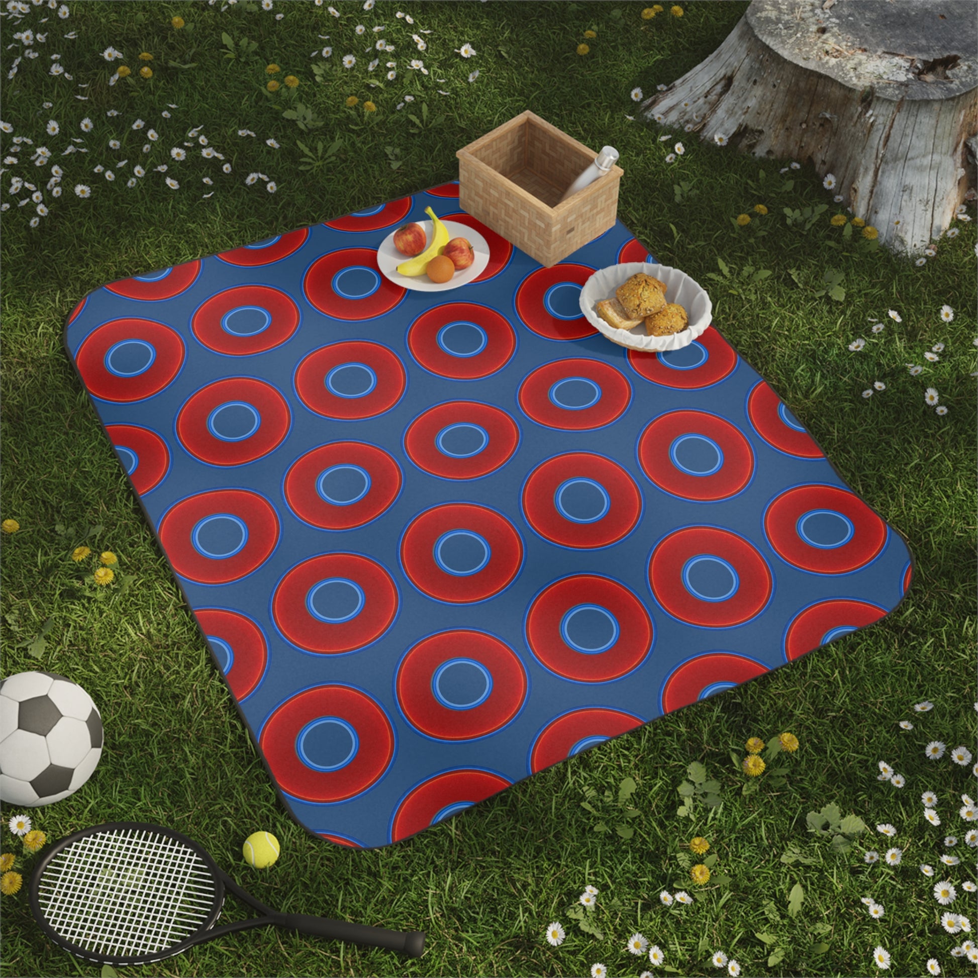 The Lumpy Party Blanket - giant water-resistant outdoor blanket [61" x 51"] - vivid red donuts w/light navy background