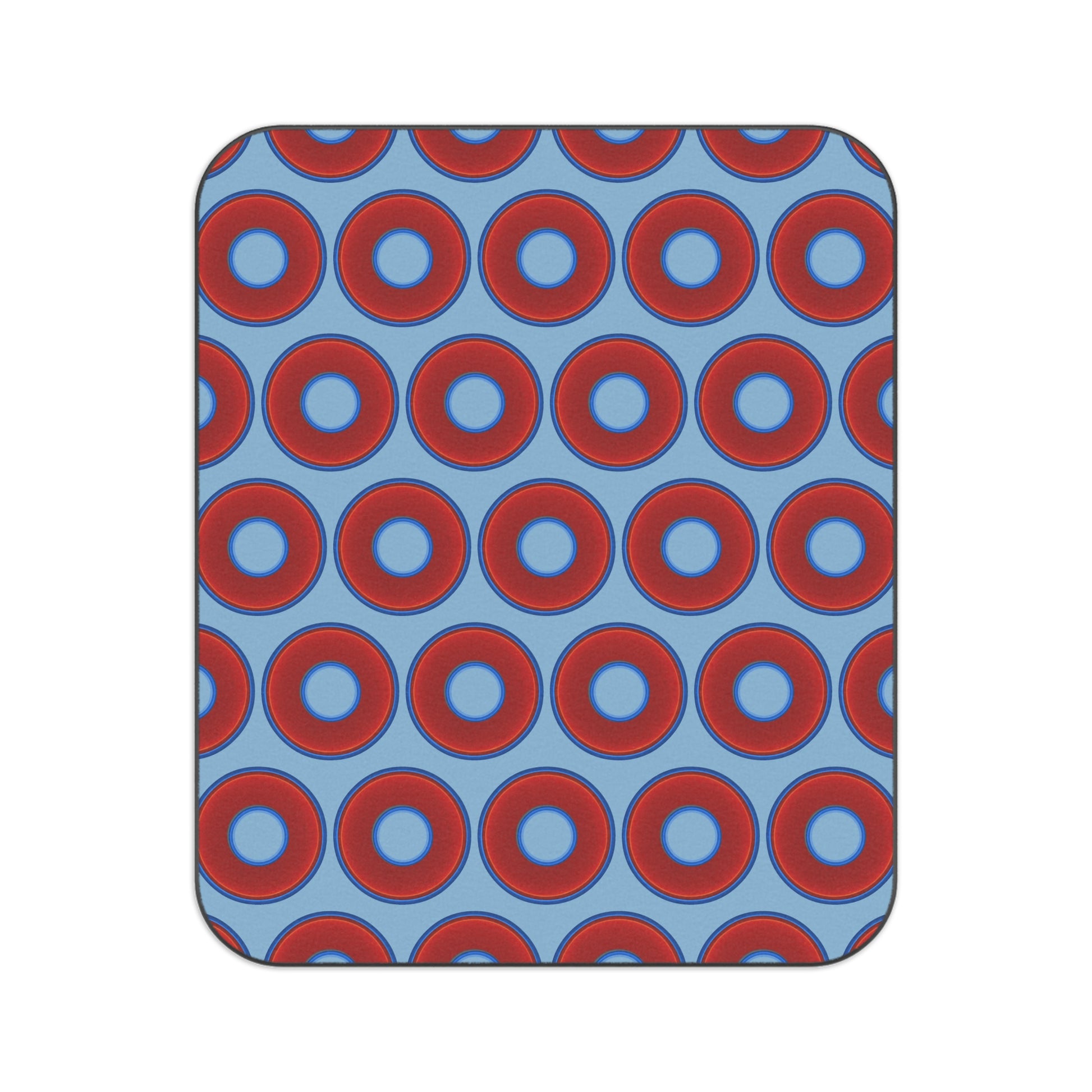 The Lumpy Party Blanket - giant water-resistant outdoor blanket [61" x 51"] - vivid red donuts w/light sky blue background