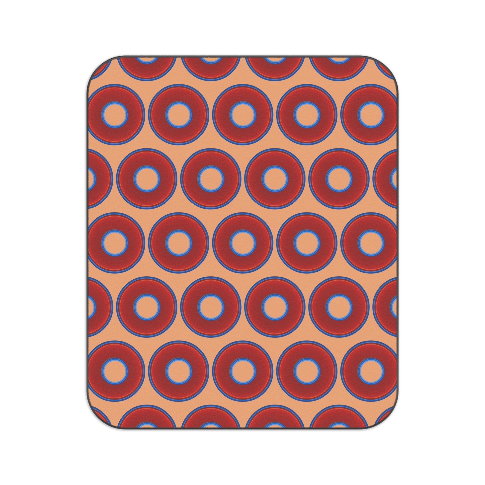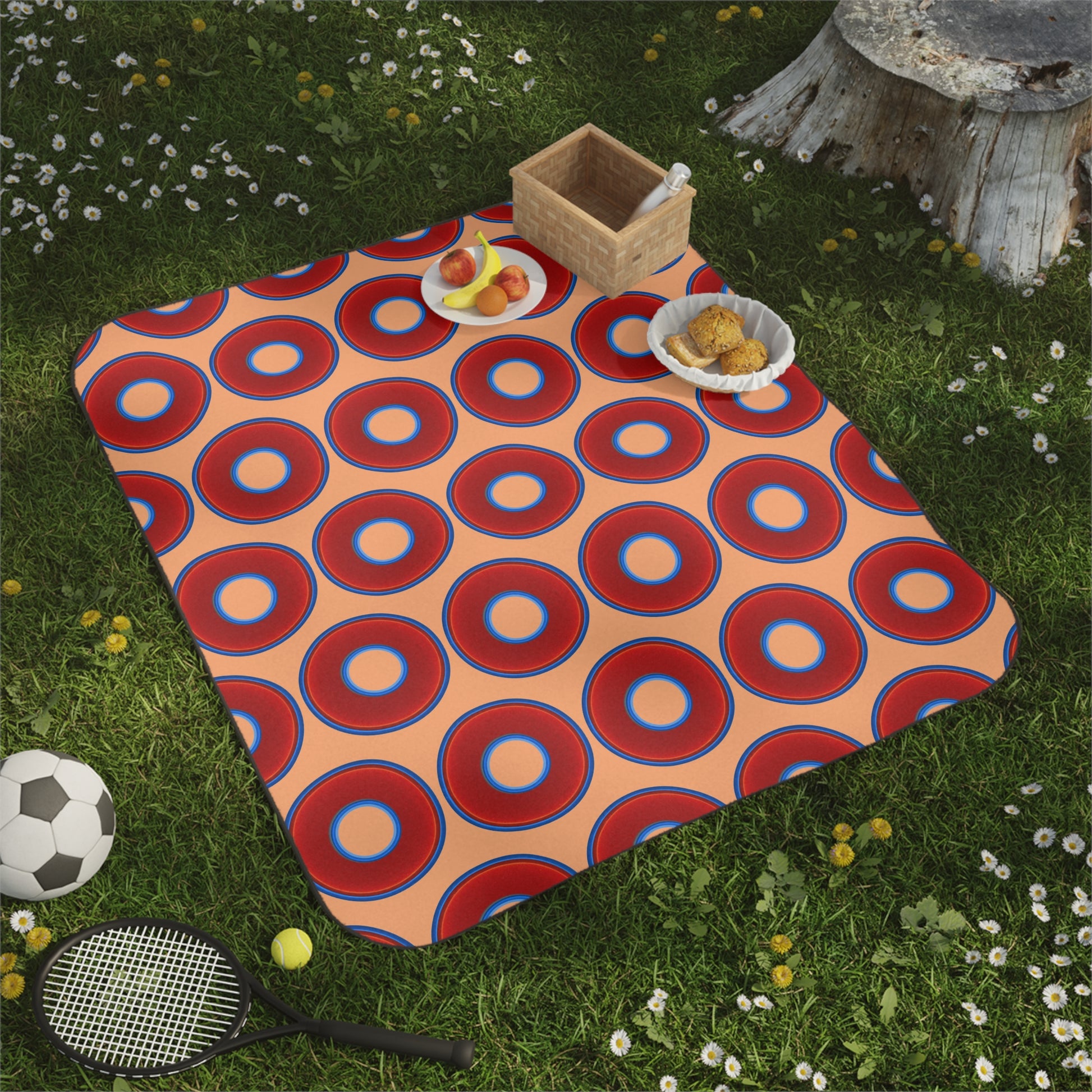 The Lumpy Party Blanket - giant water-resistant outdoor blanket [61" x 51"] - vivid red donuts w/peach background