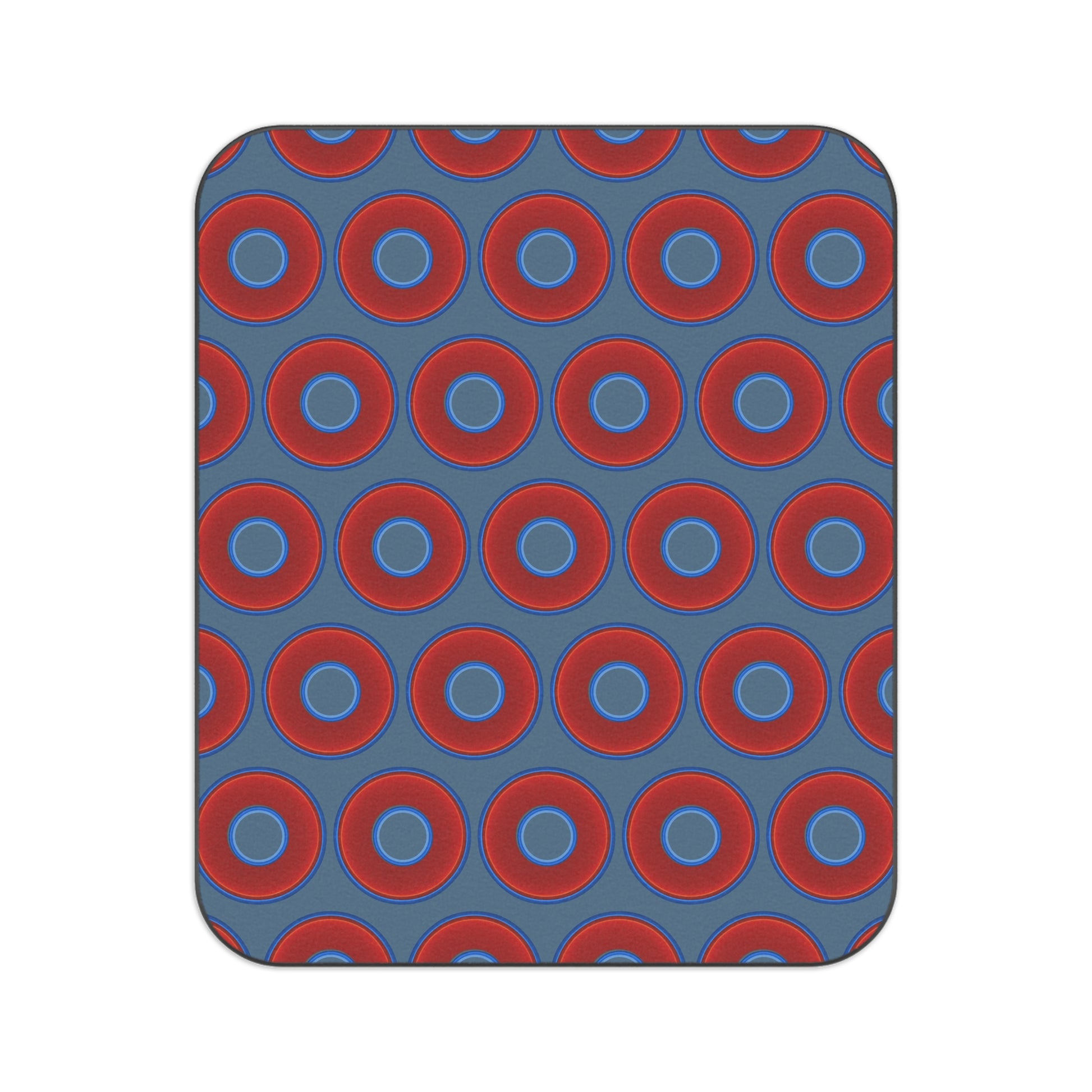 The Lumpy Party Blanket - giant water-resistant outdoor blanket [61" x 51"] - vivid red donuts w/steel blue background