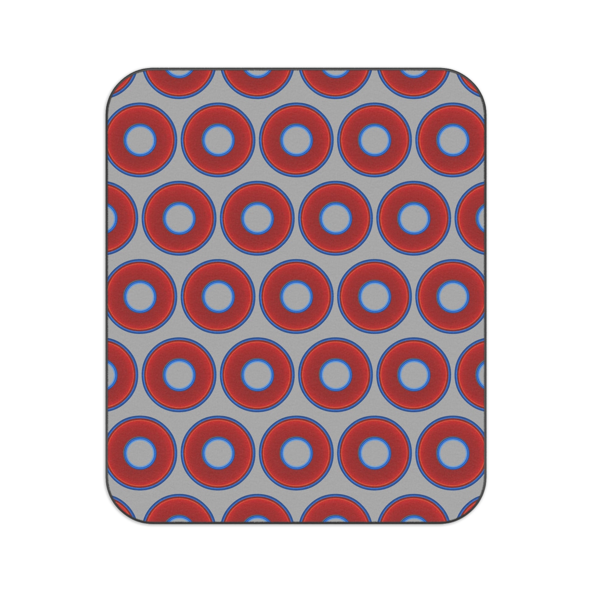 The Lumpy Party Blanket - giant water-resistant outdoor blanket [61" x 51"] - vivid red donuts w/light gray background