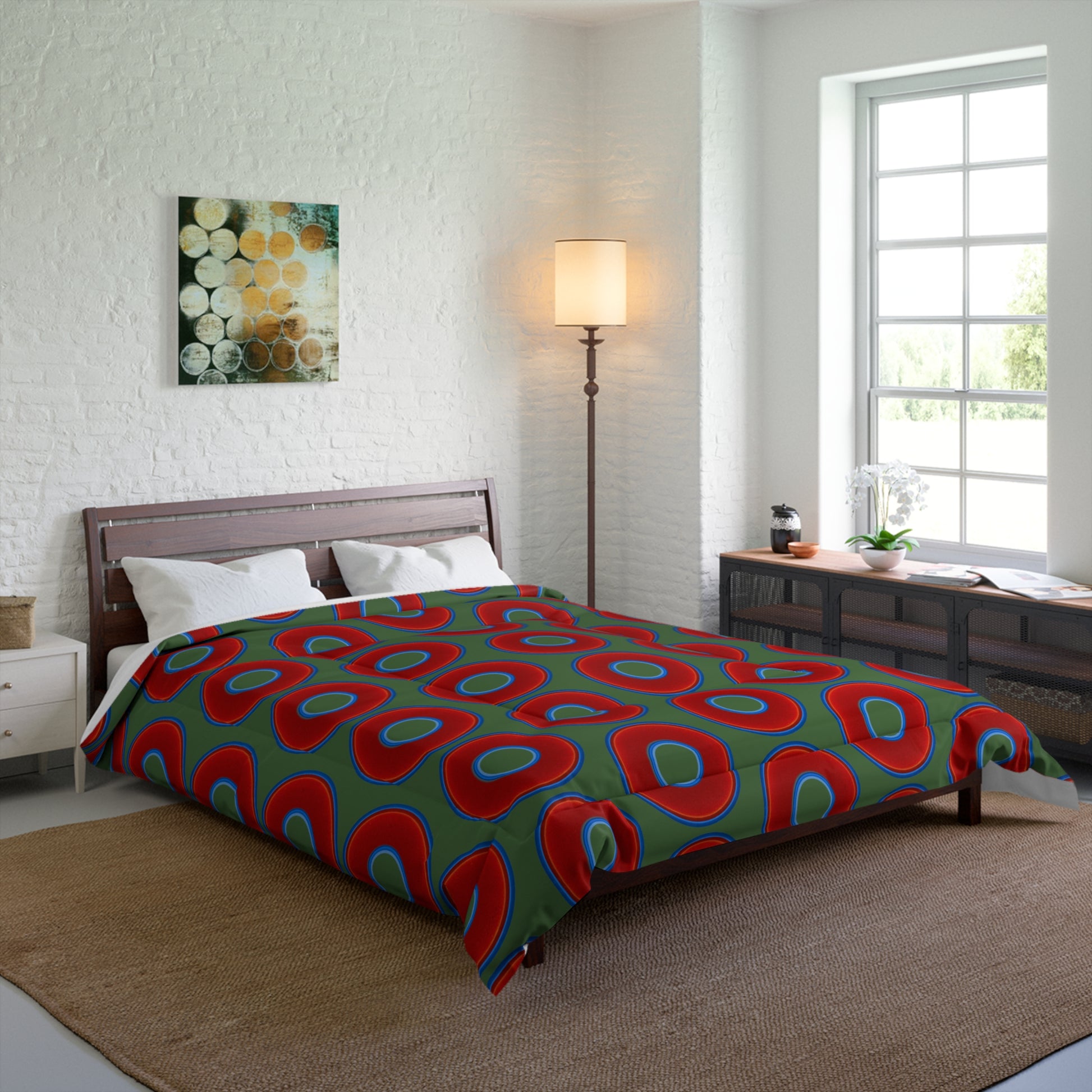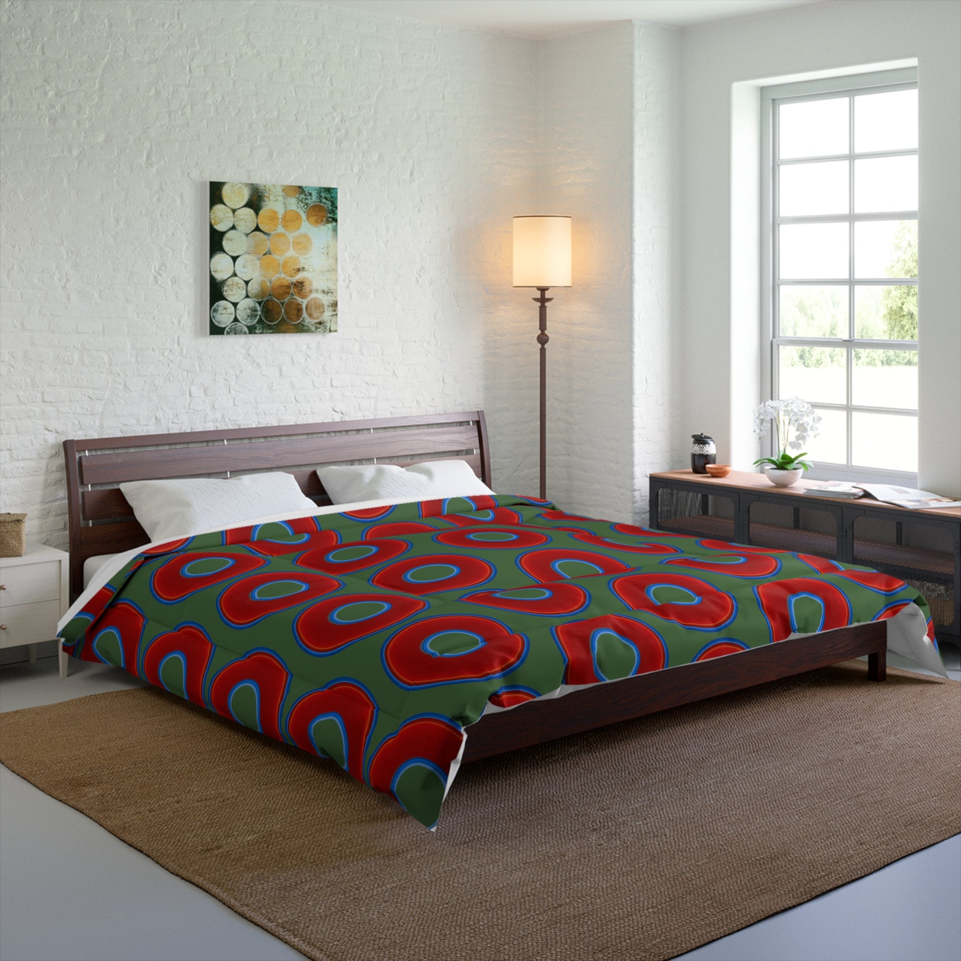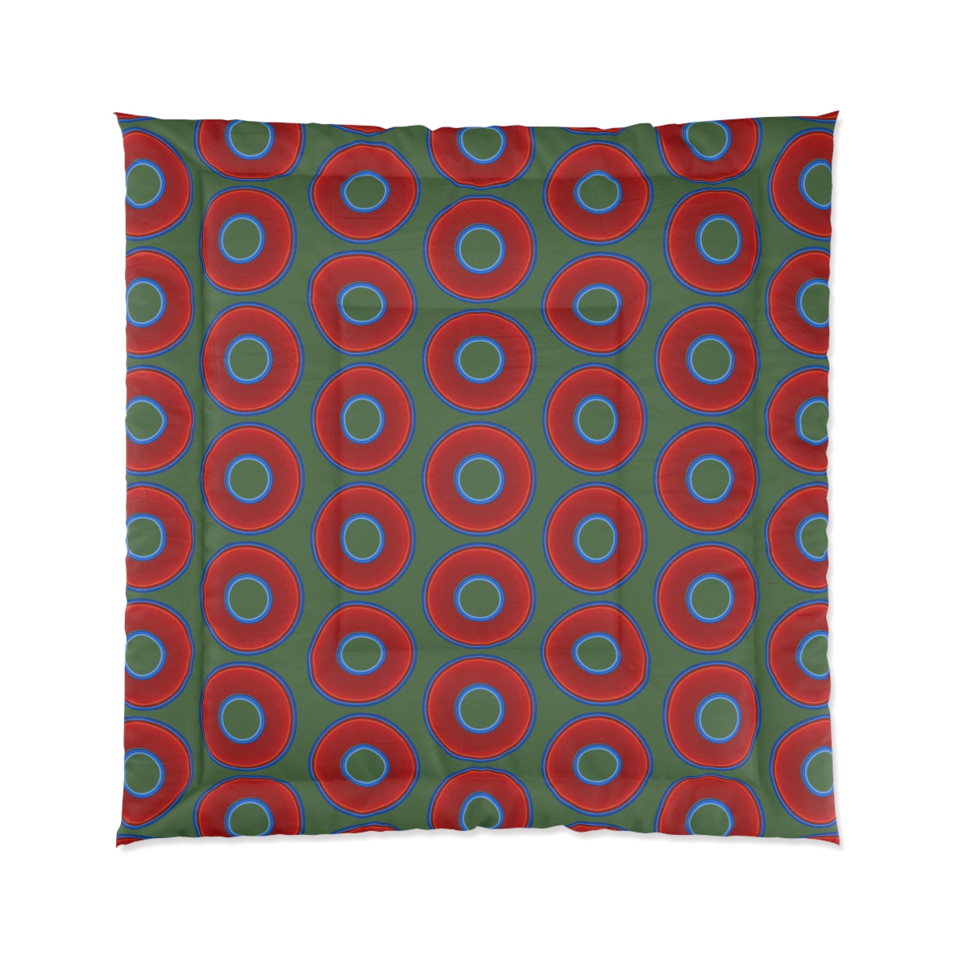 The Very Lumpy Comforter - vivid red donuts w/dark green background