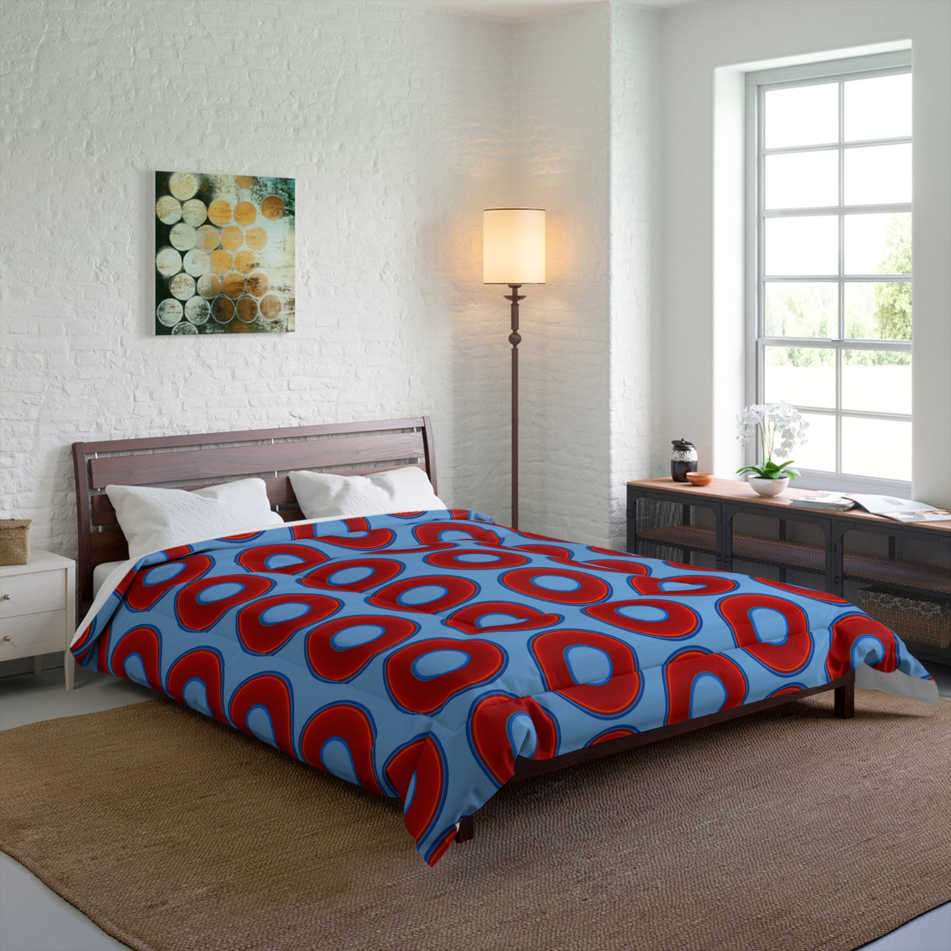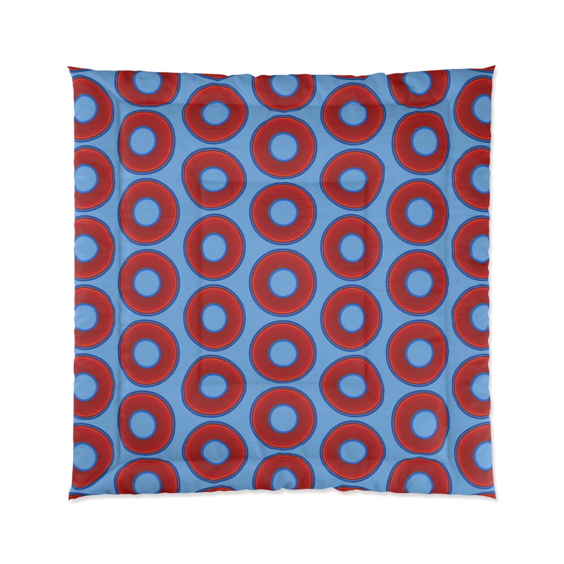 The Very Lumpy Comforter - vivid red donuts w/light blue background