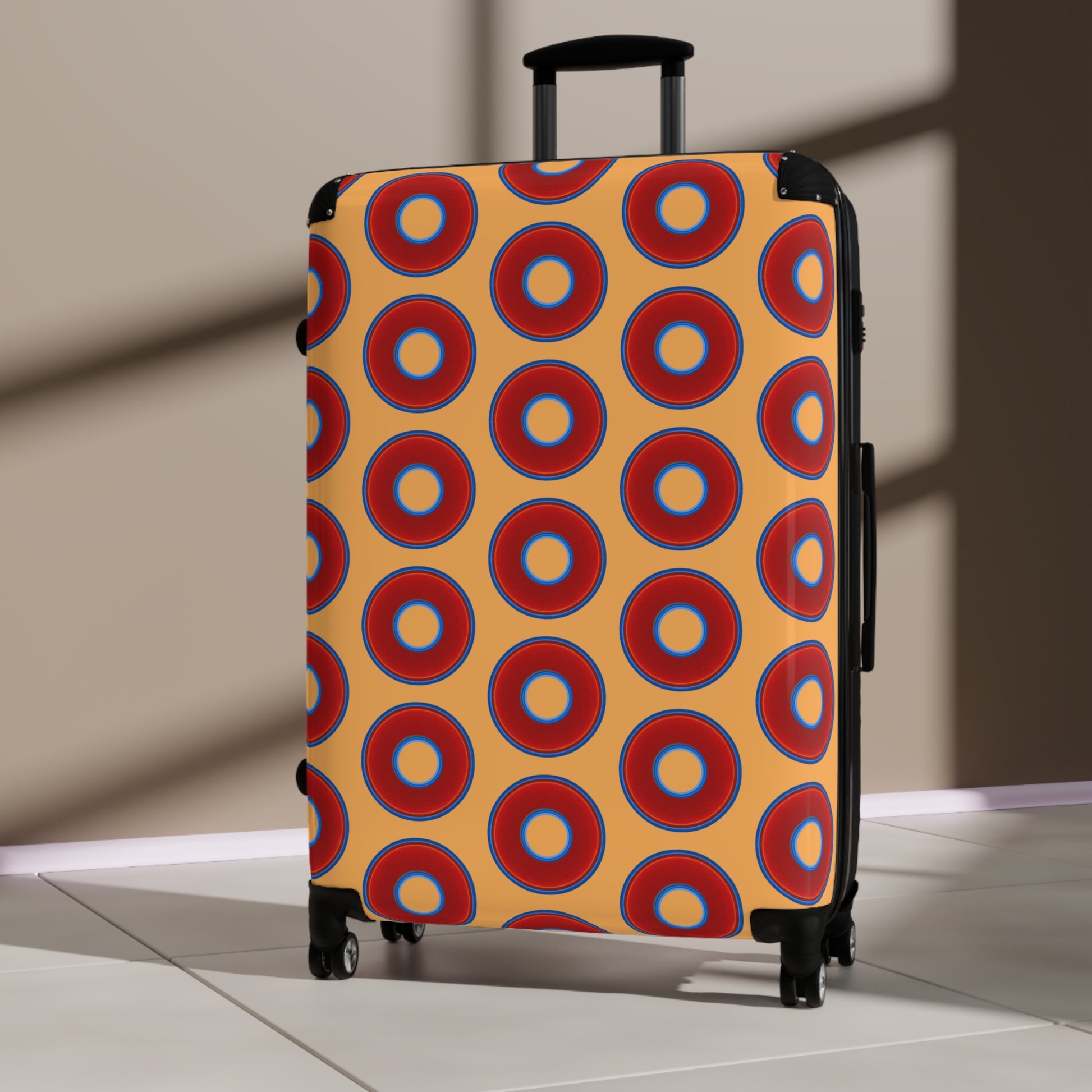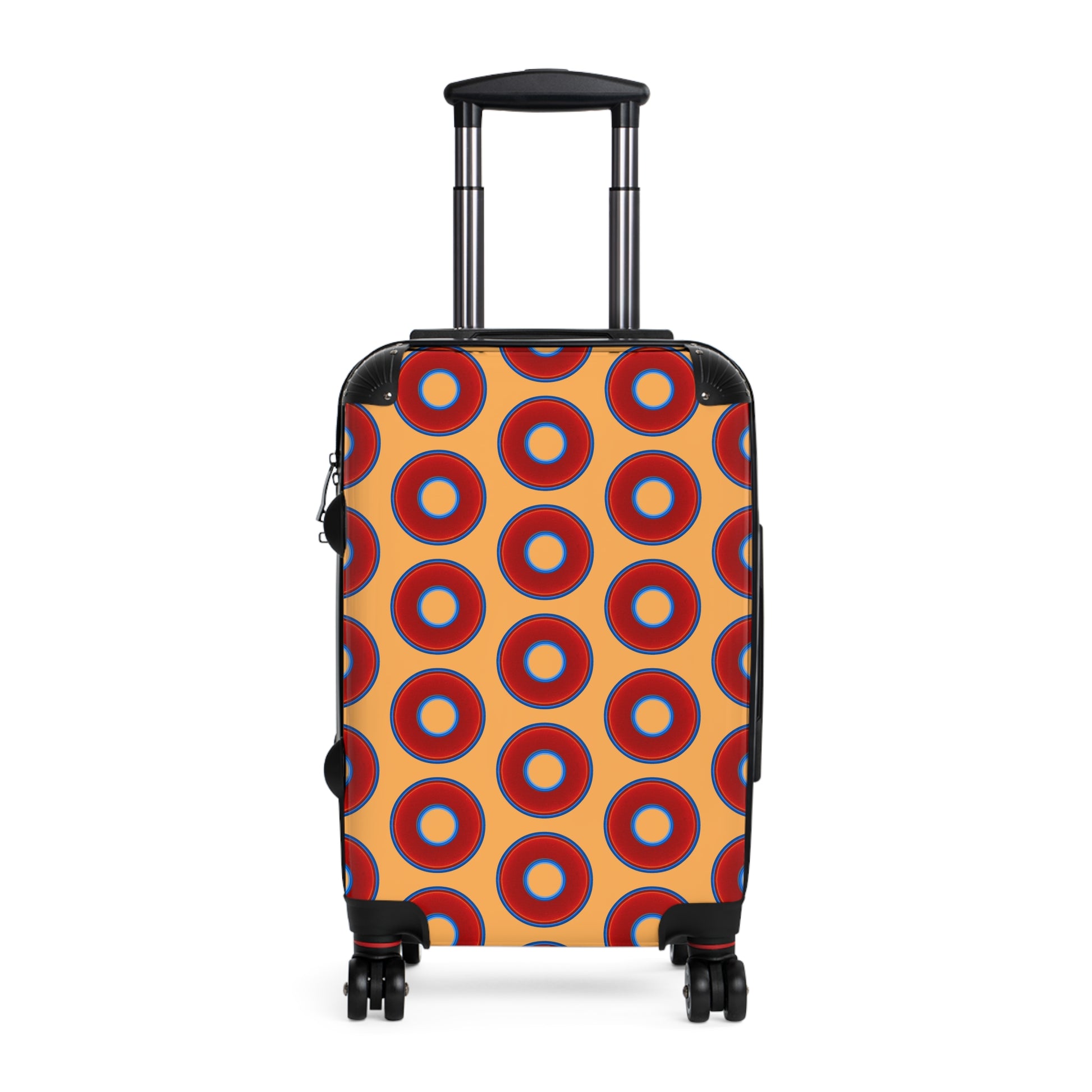 The Very Lumpy Donut Suitcase series - your choice of S, M or L - vivid red donut print w/creamcicle orange background
