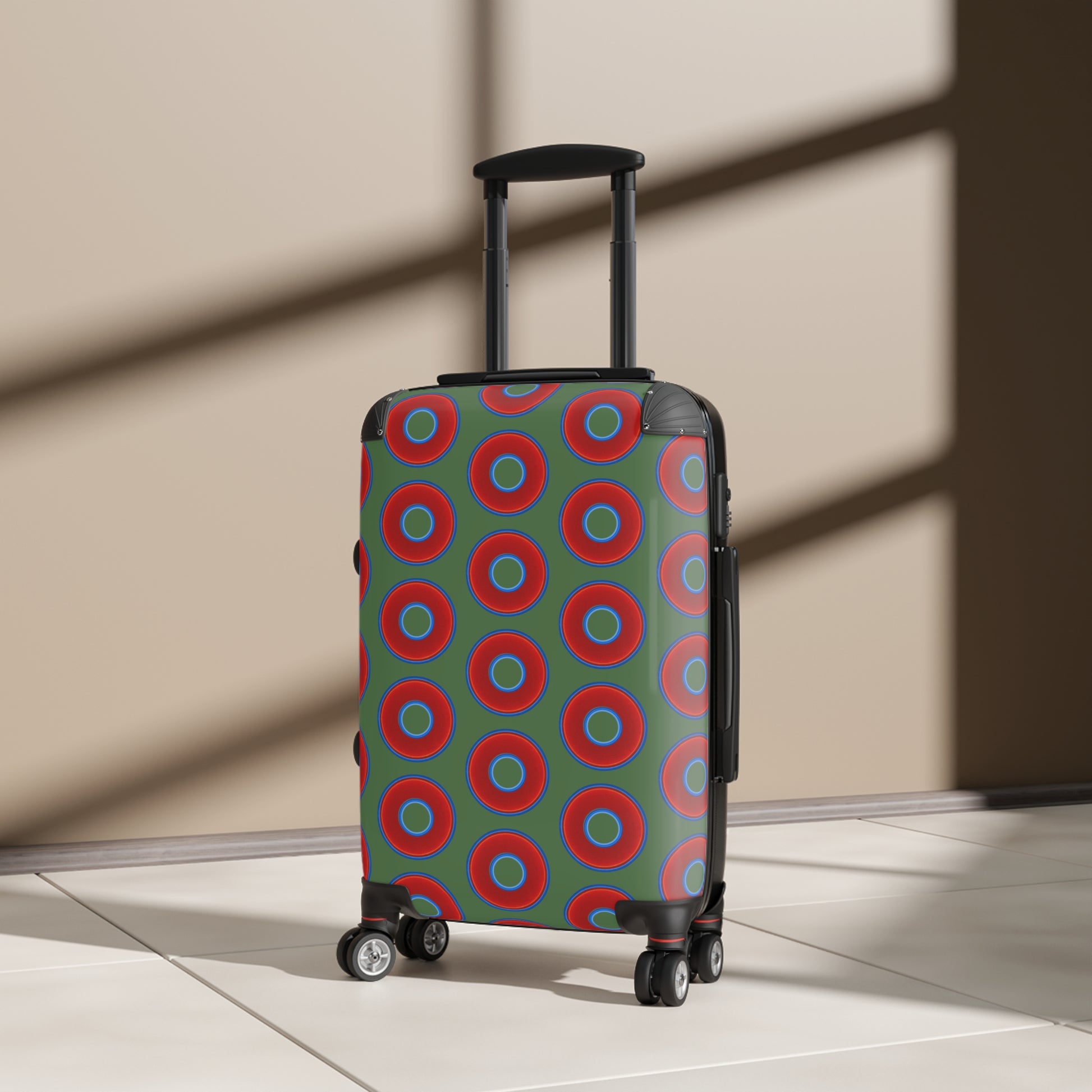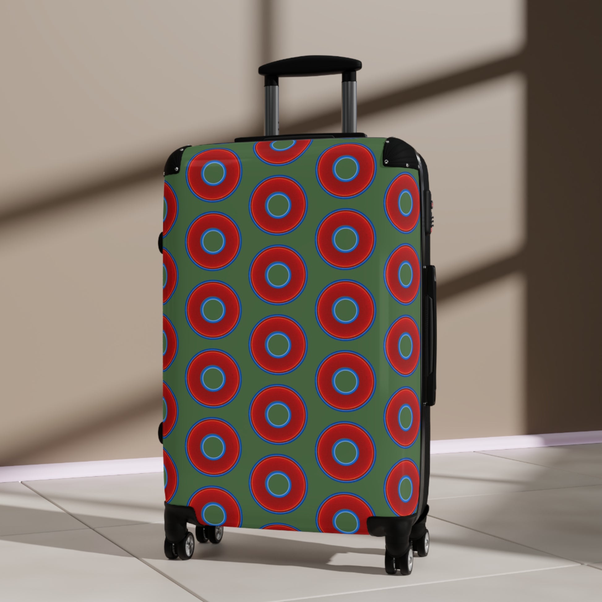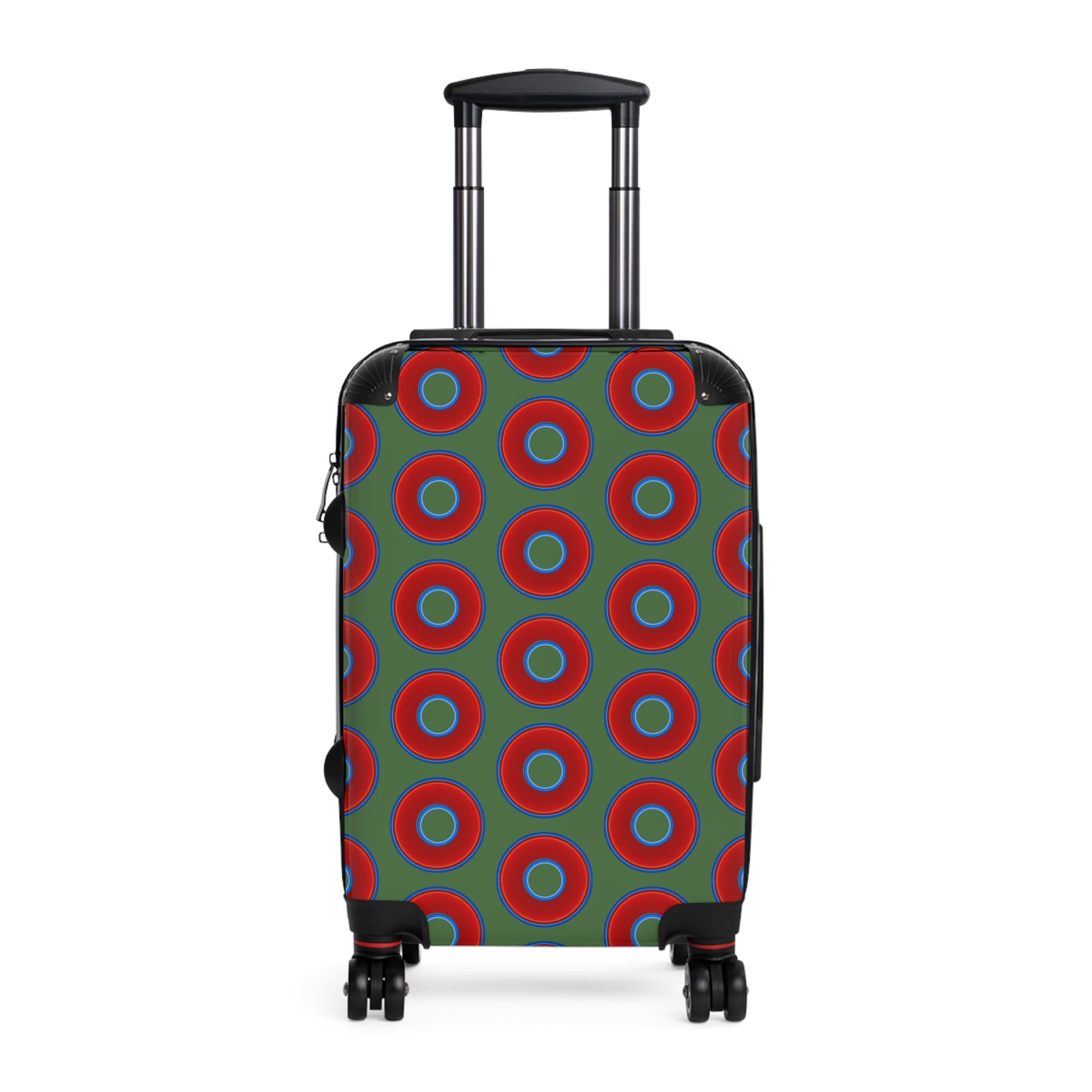 The Very Lumpy Donut Suitcase series - your choice of S, M or L - vivid red donut print w/dark Fenway green background