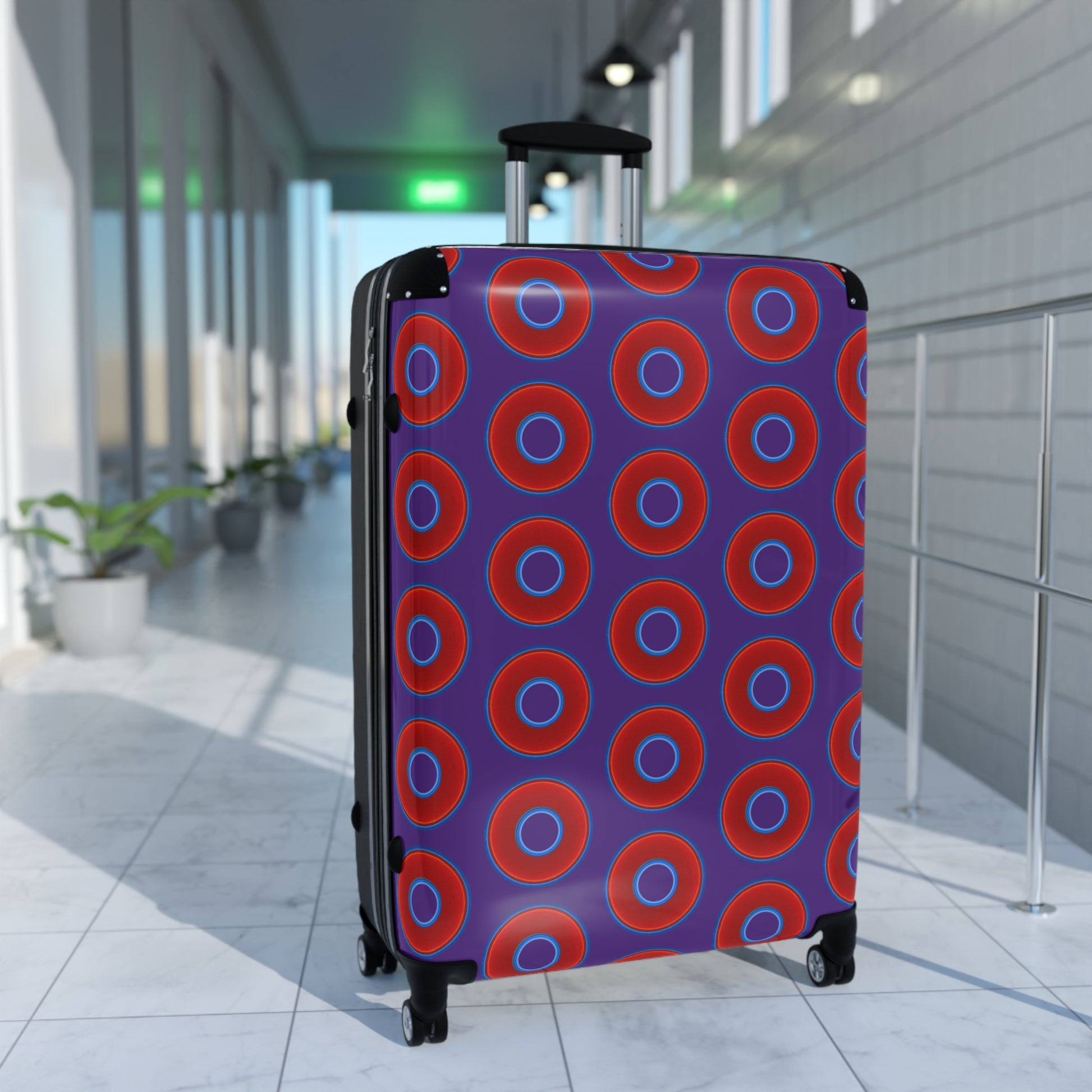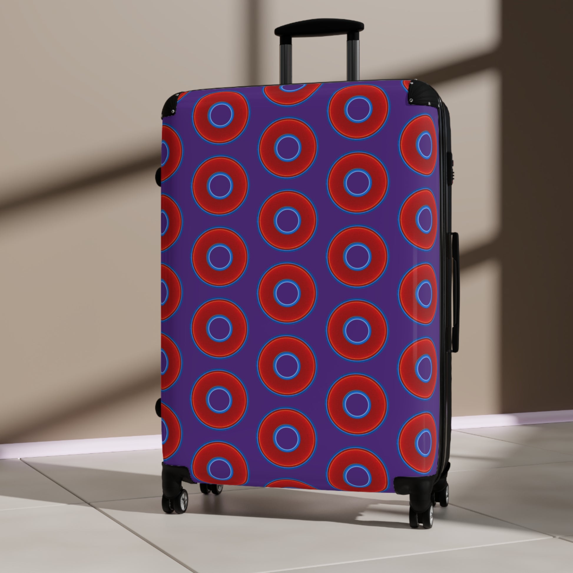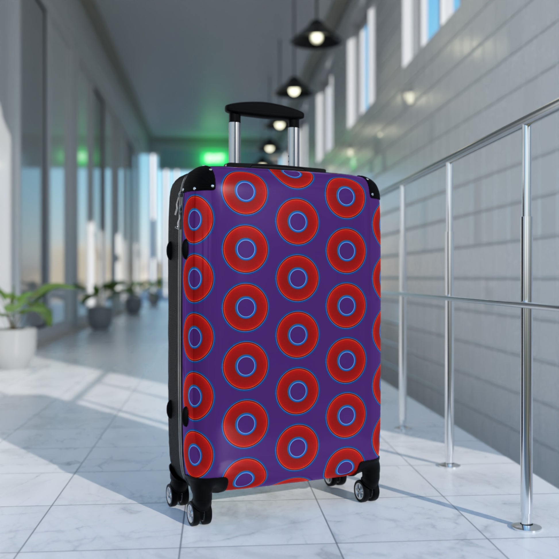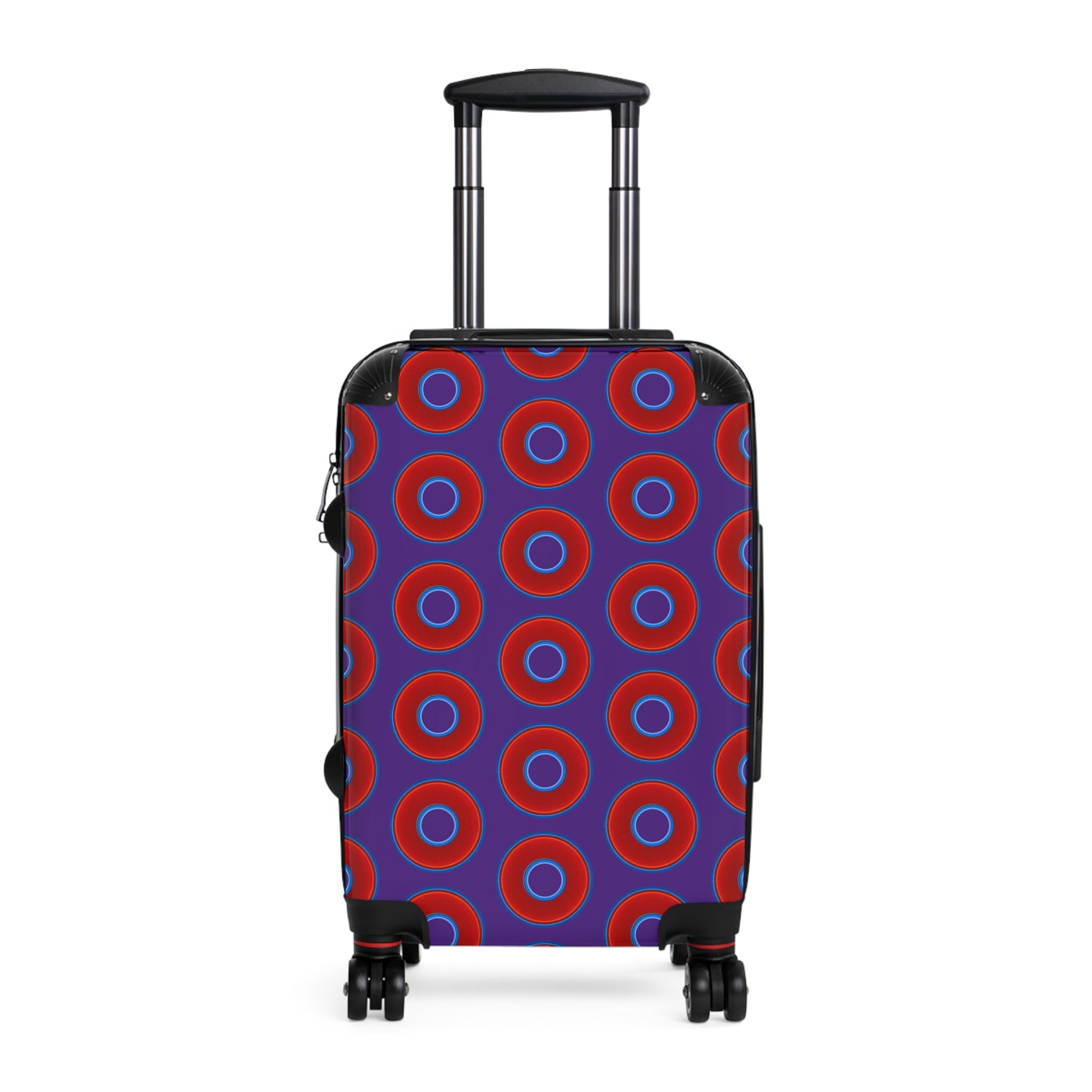 The Very Lumpy Donut Suitcase series - your choice of S, M or L - vivid red donut print w/dark purple background