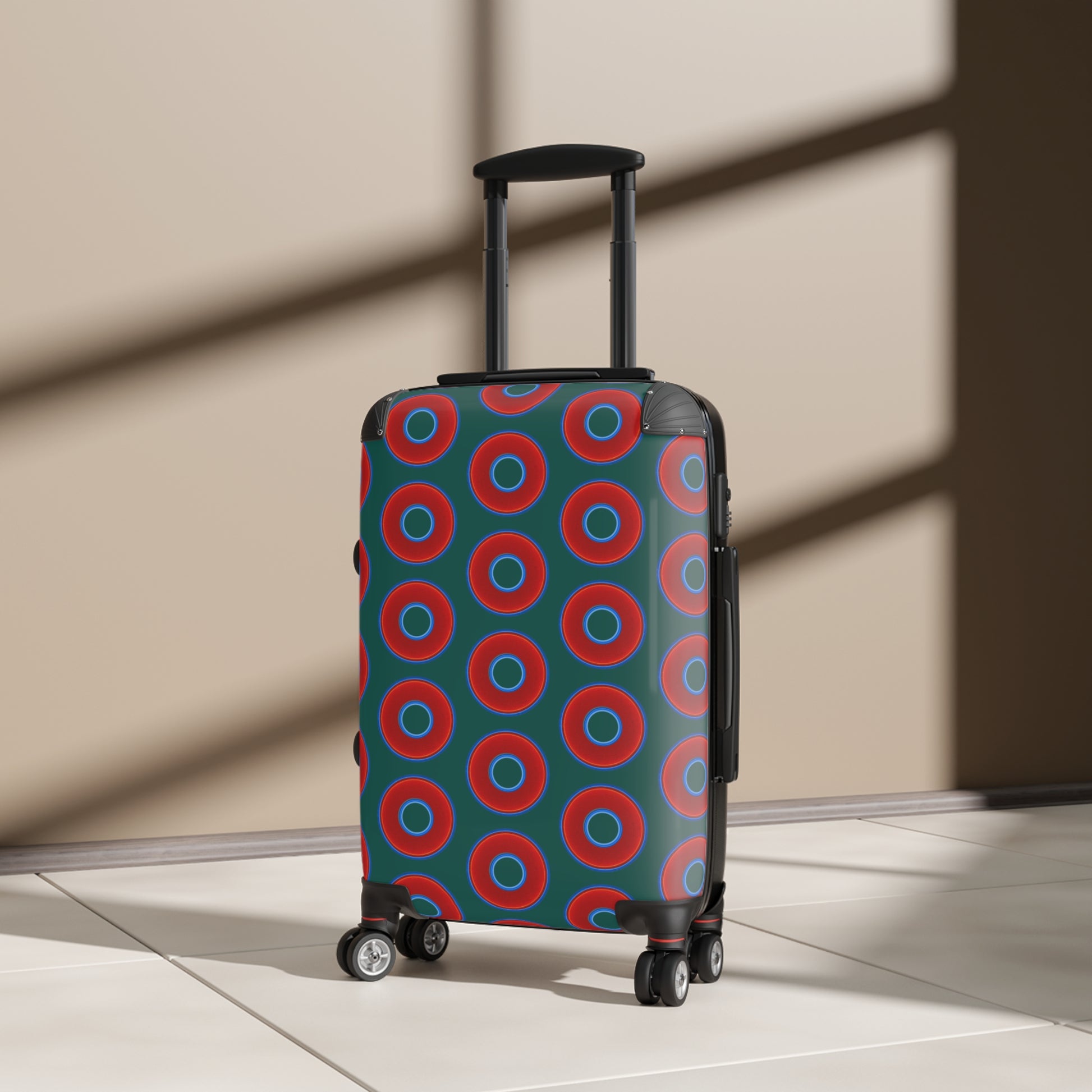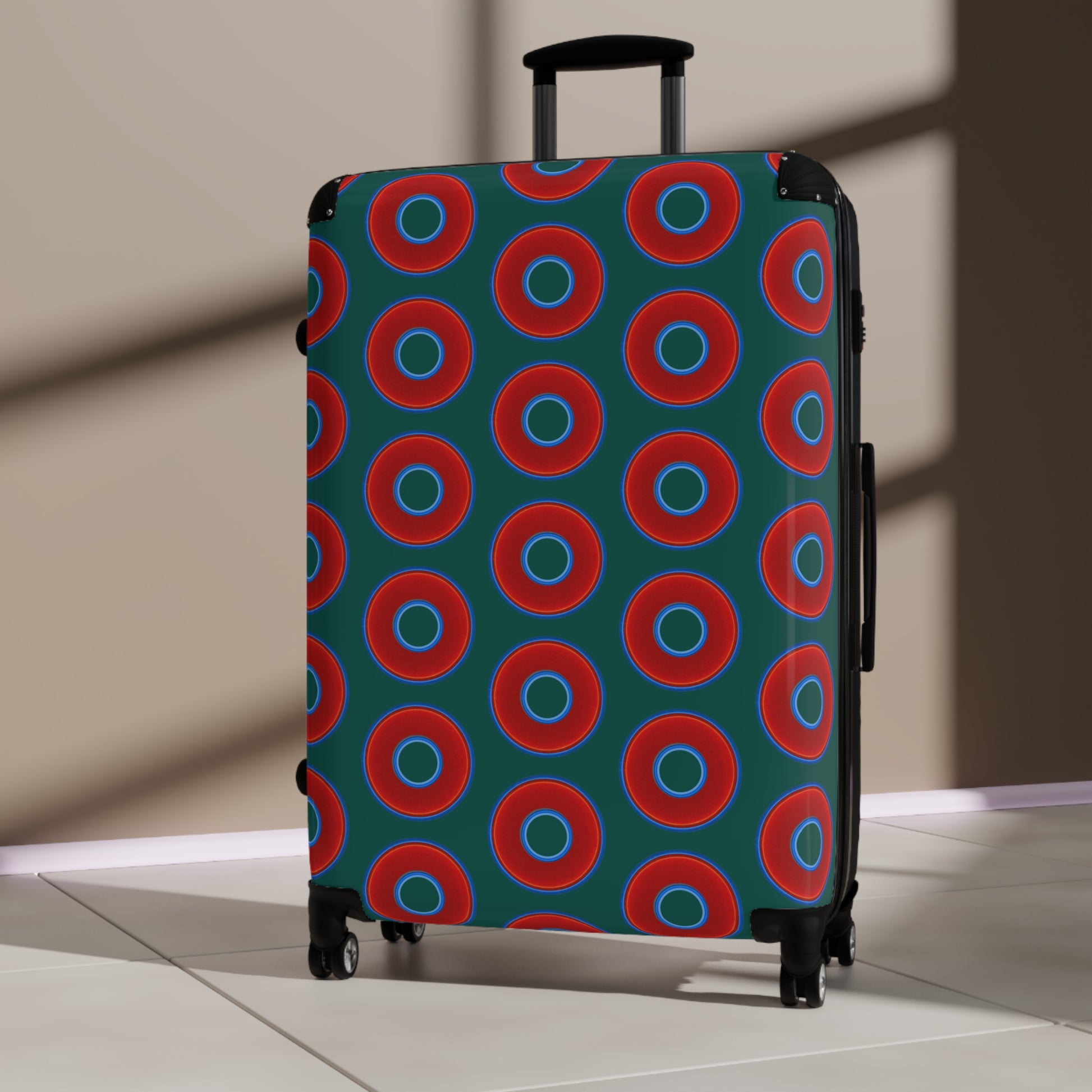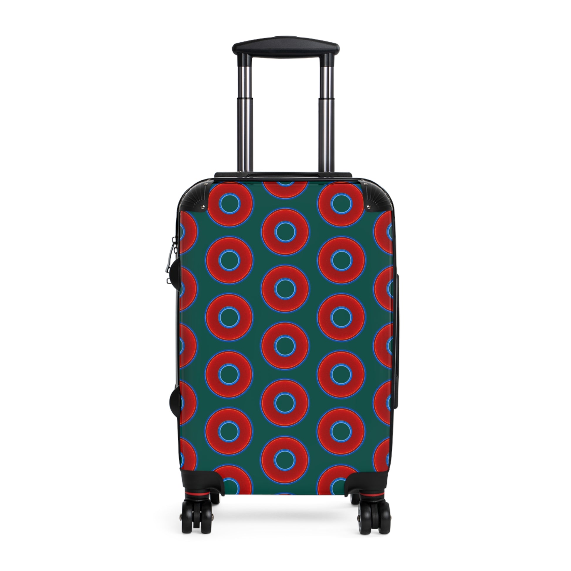 The Very Lumpy Donut Suitcase series - your choice of S, M or L - vivid red donut print w/grayish green background