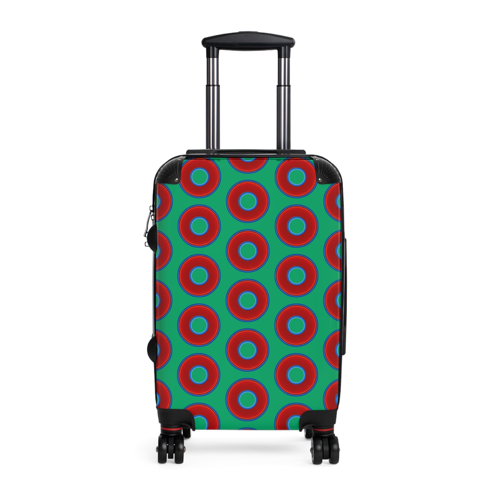 The Very Lumpy Donut Suitcase series - your choice of S, M or L - vivid red donut print w/jade green background