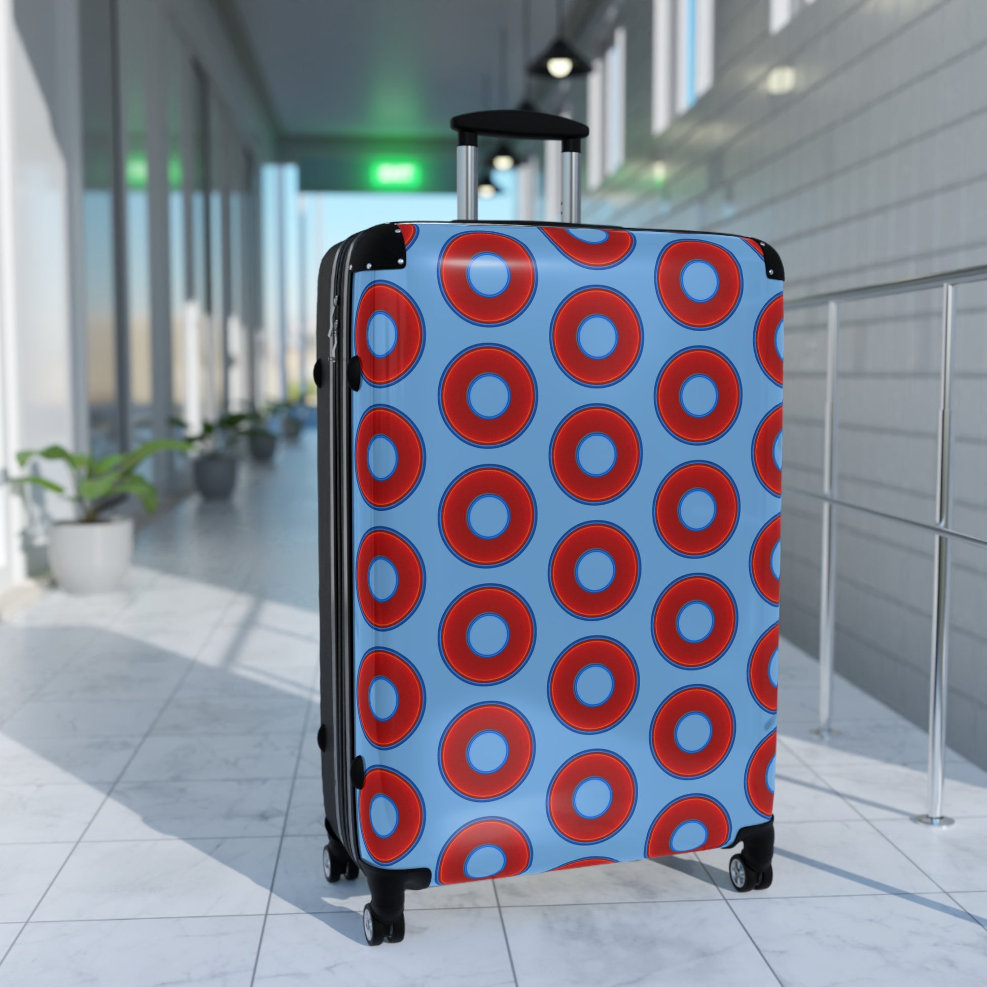 The Very Lumpy Donut Suitcase series - your choice of S, M or L - vivid red donut print w/light blue background