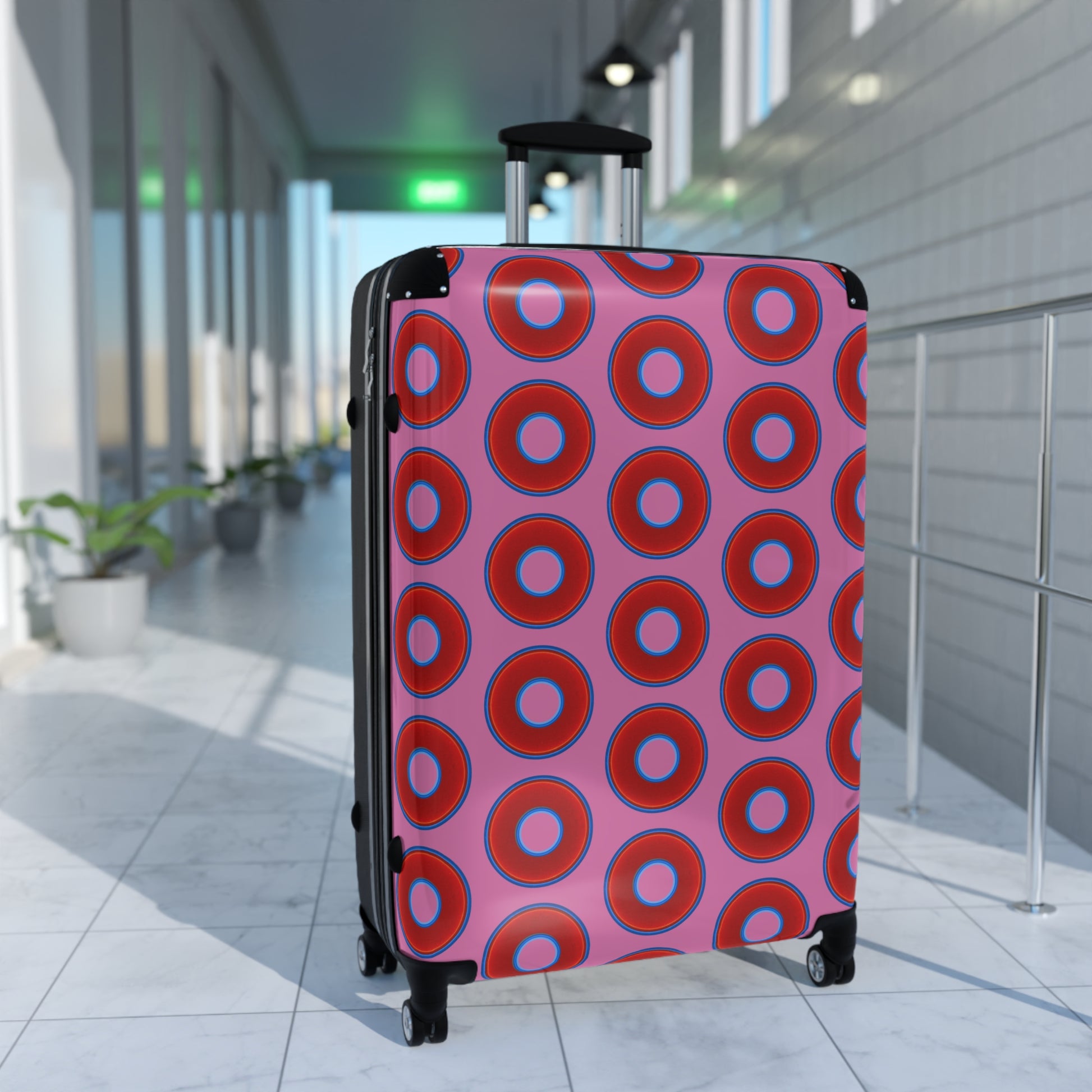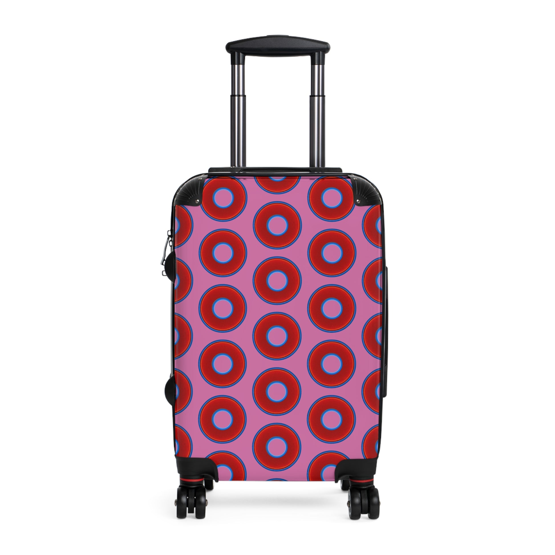 The Very Lumpy Donut Suitcase series - your choice of S, M or L - vivid red donut print w/light pink background