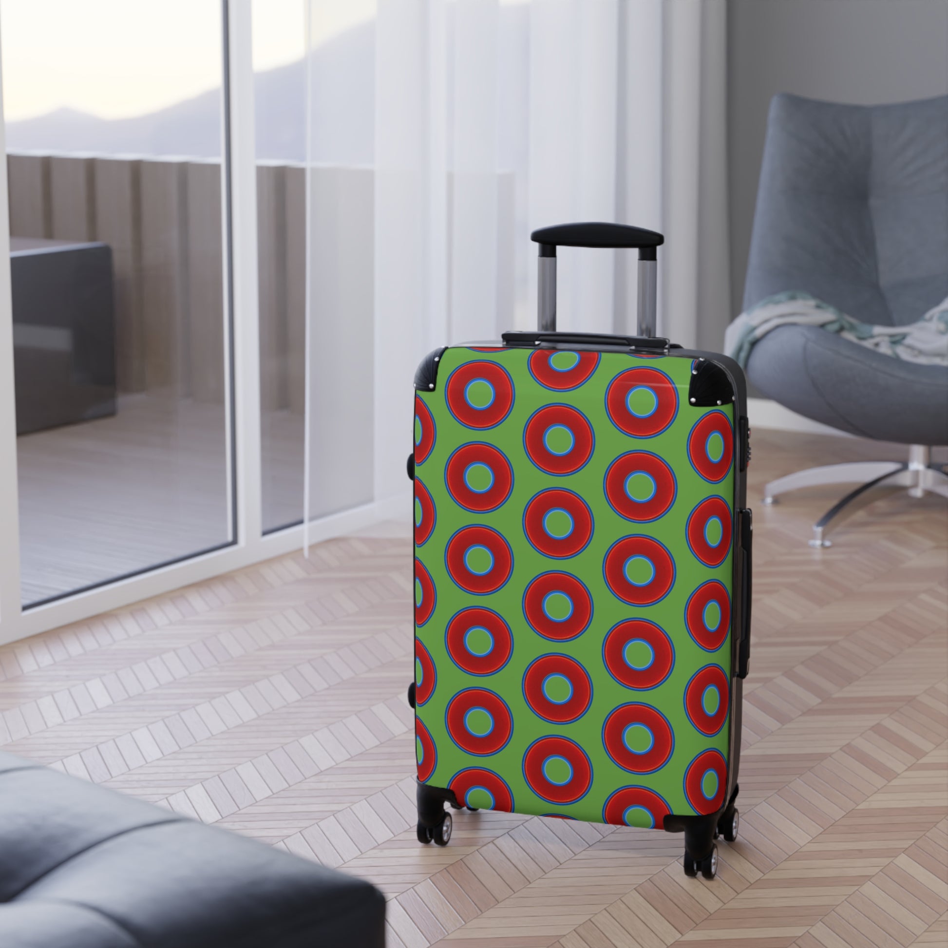The Very Lumpy Donut Suitcase series - your choice of S, M or L - vivid red donut print w/lime green background