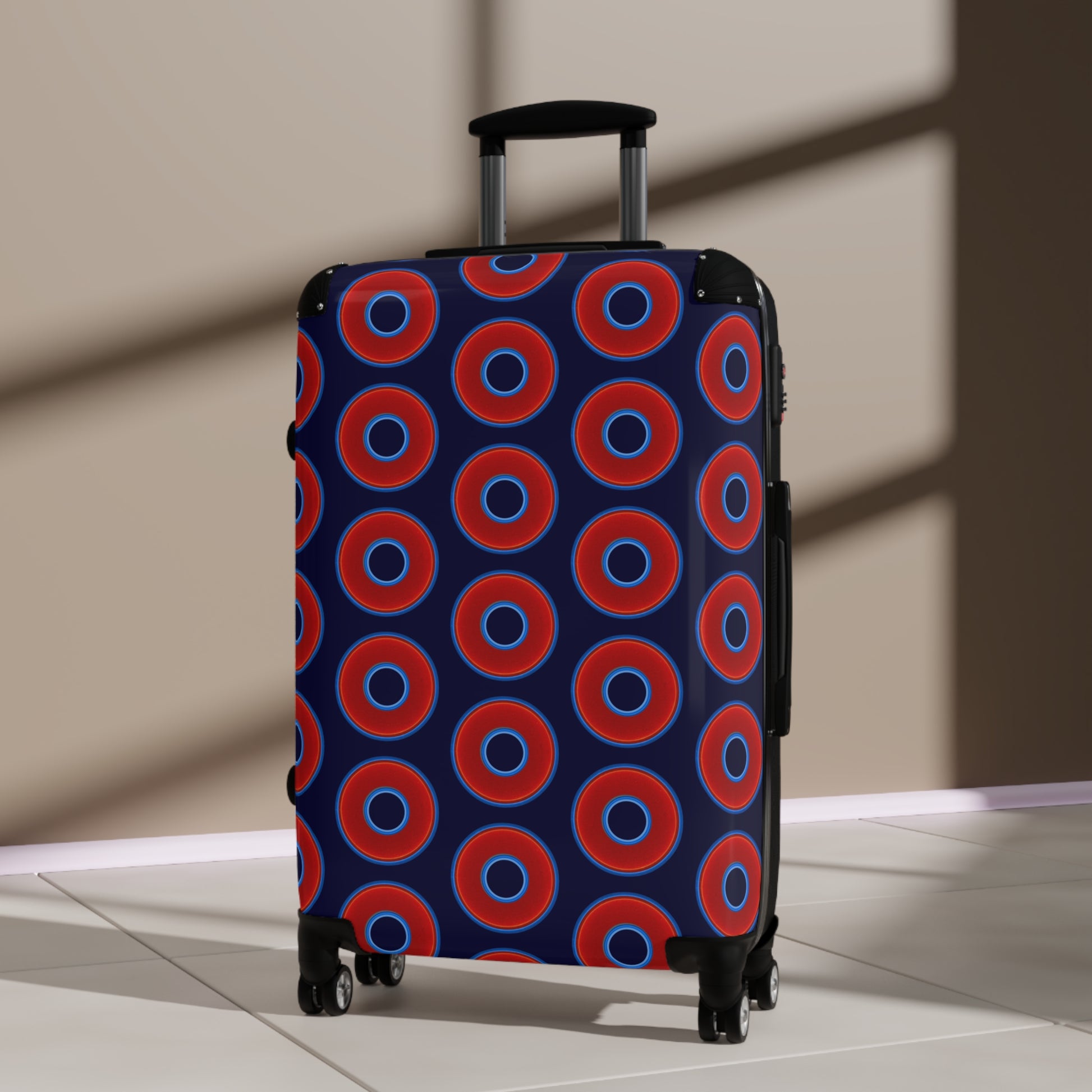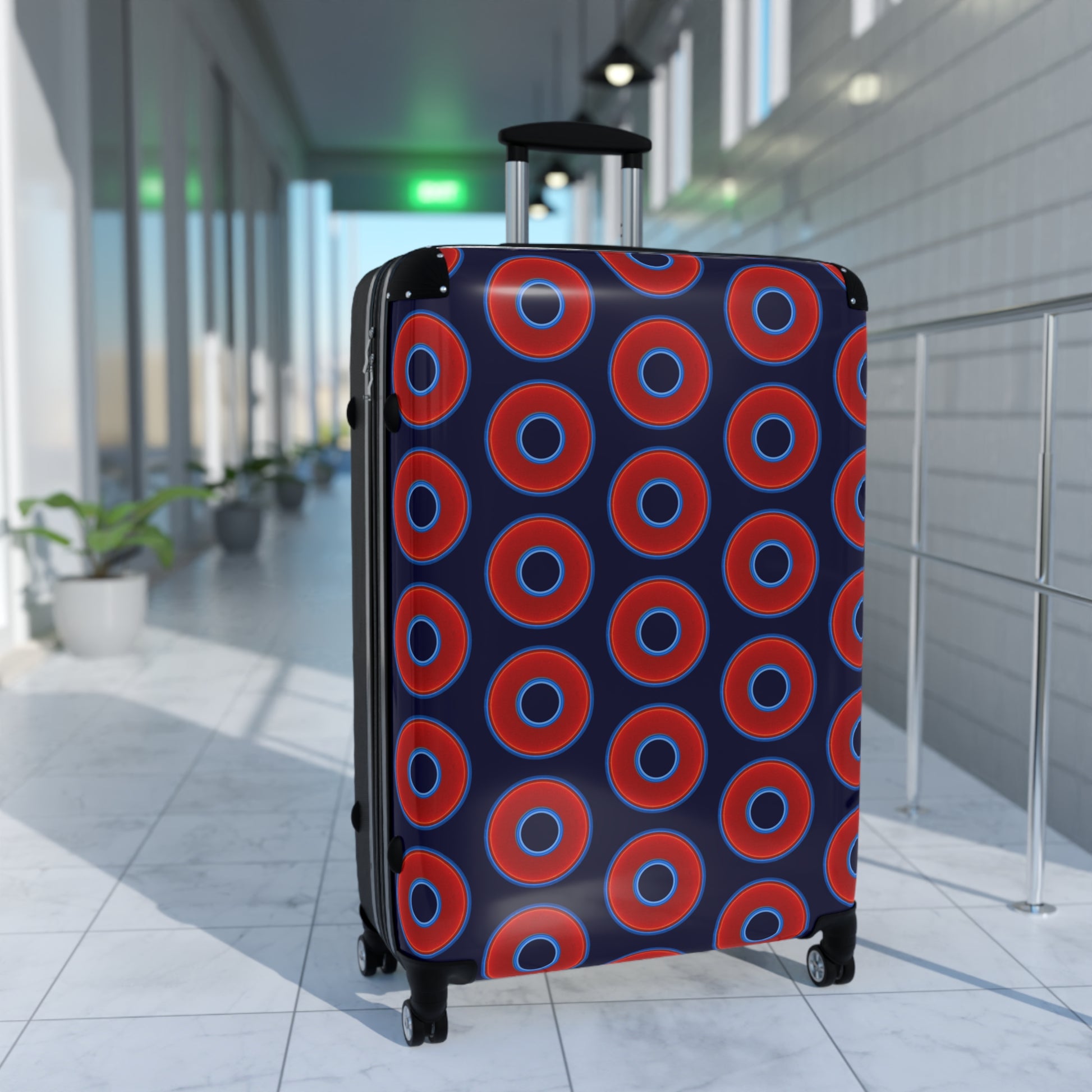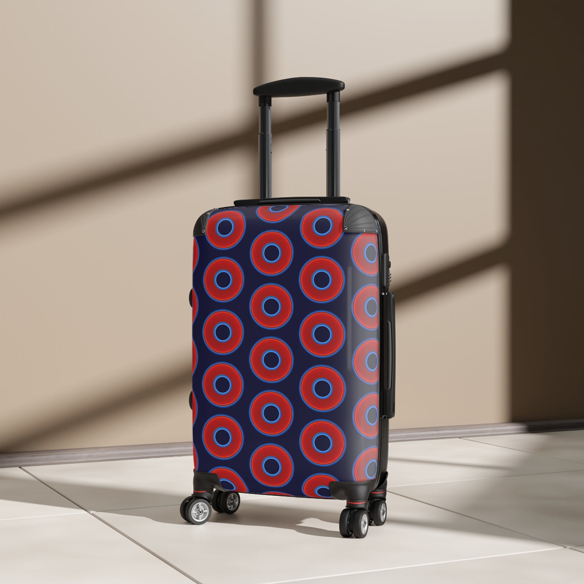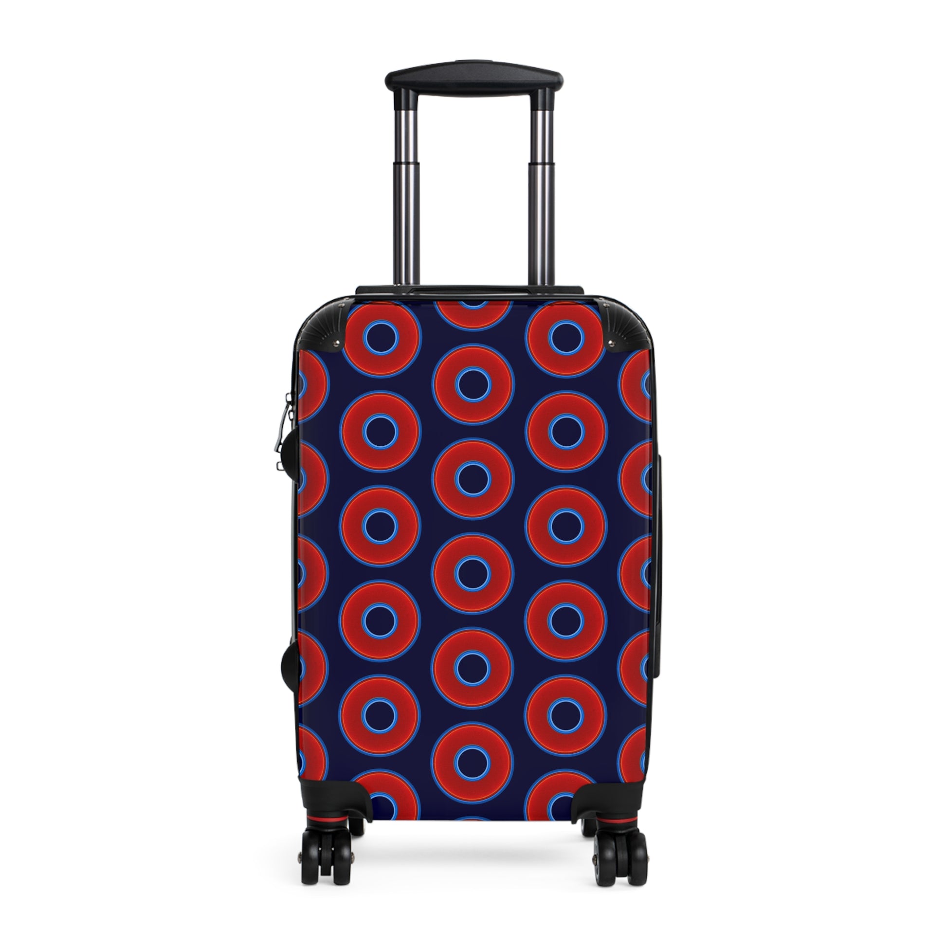 The Very Lumpy Donut Suitcase series - your choice of S, M or L - vivid red donut print w/midnight blue background