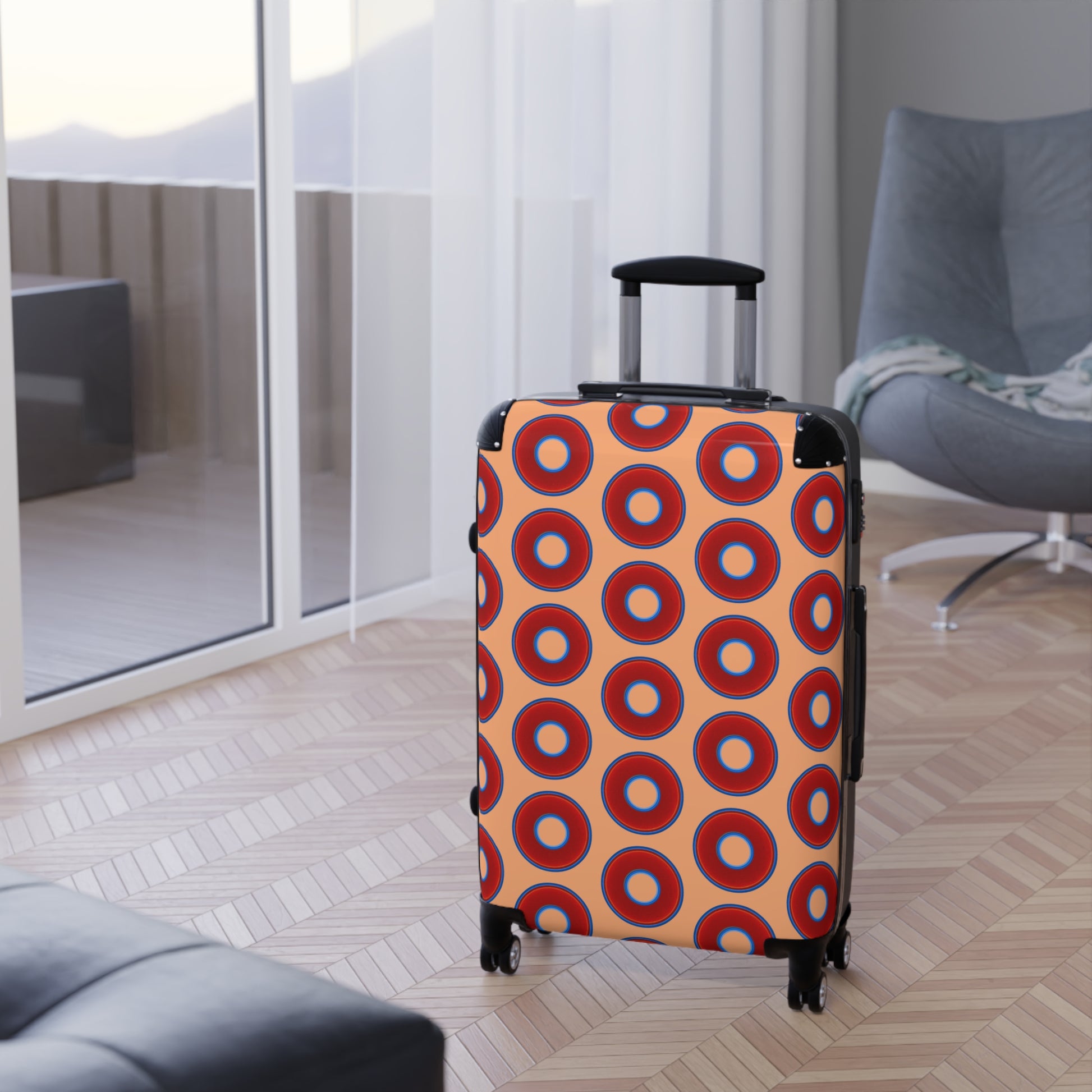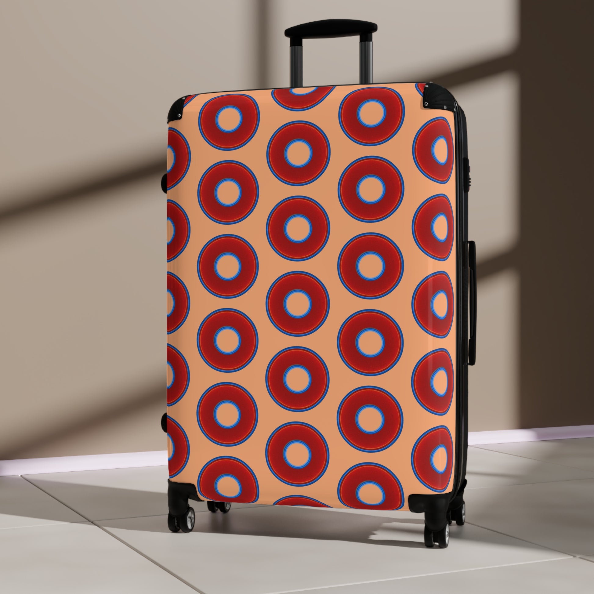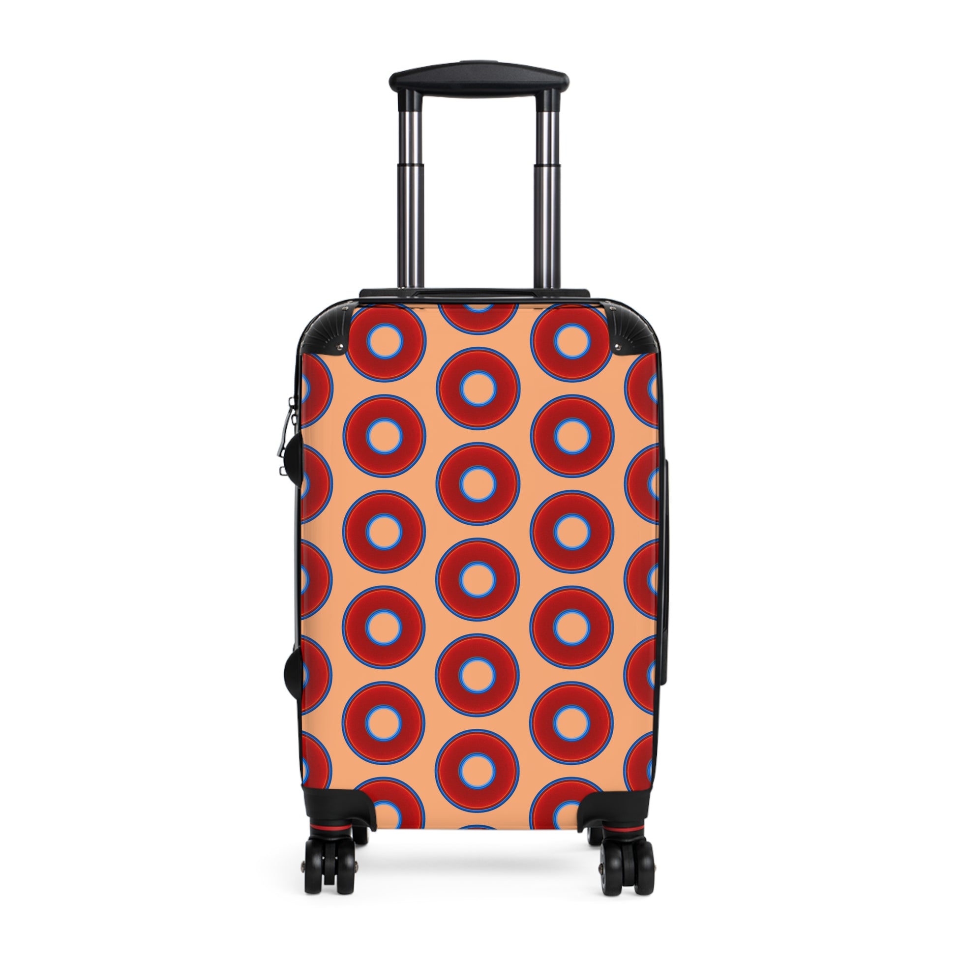 The Very Lumpy Donut Suitcase series - your choice of S, M or L - vivid red donut print w/peach background