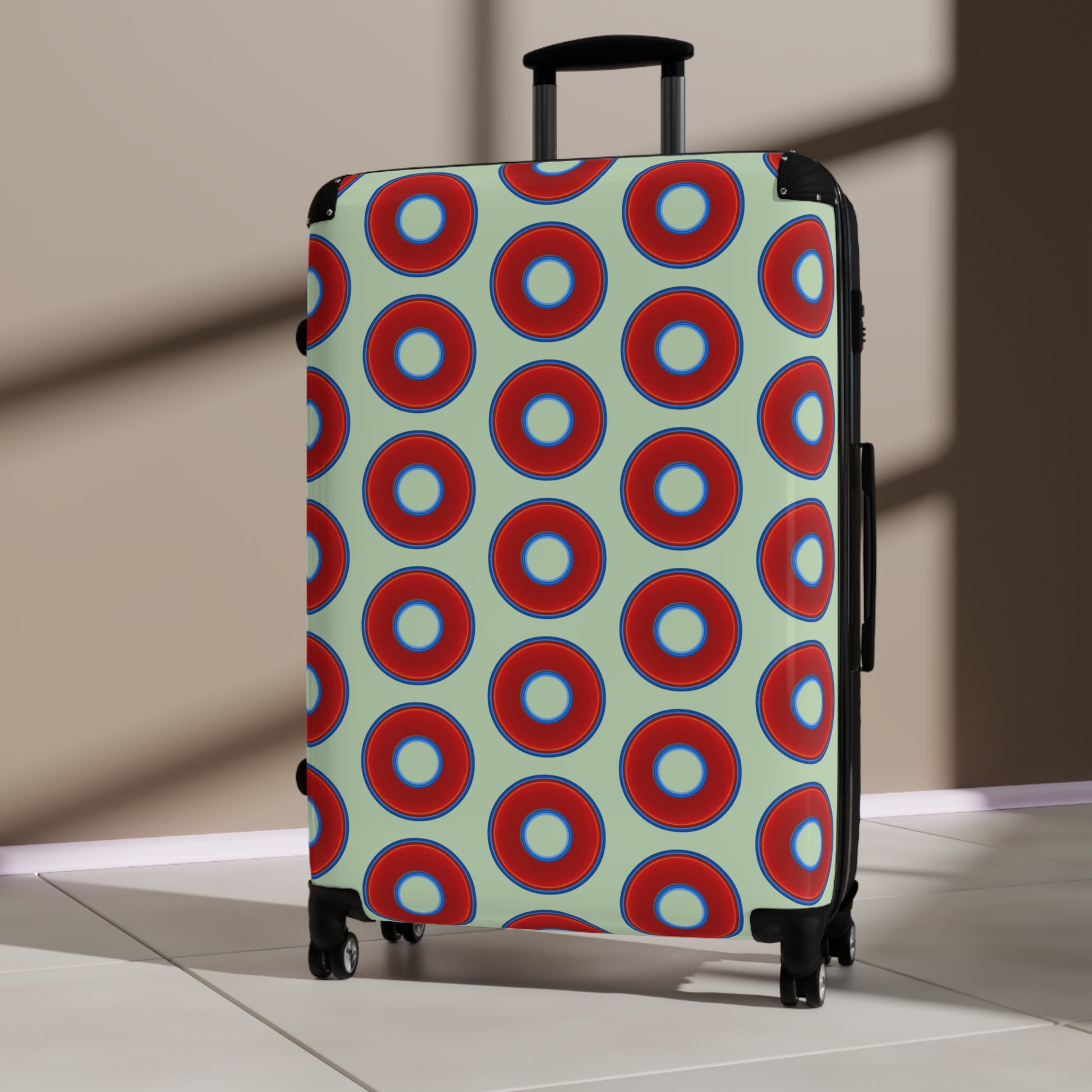 The Very Lumpy Donut Suitcase series - your choice of S, M or L - vivid red donut print w/seafoam background