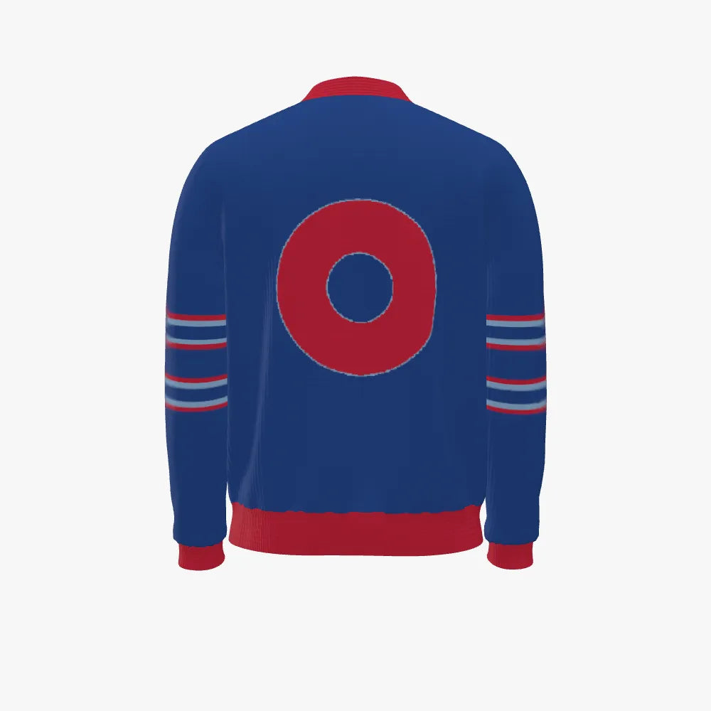 Designer V Neck Cardigan - w/2 red donuts & stripped sleeves