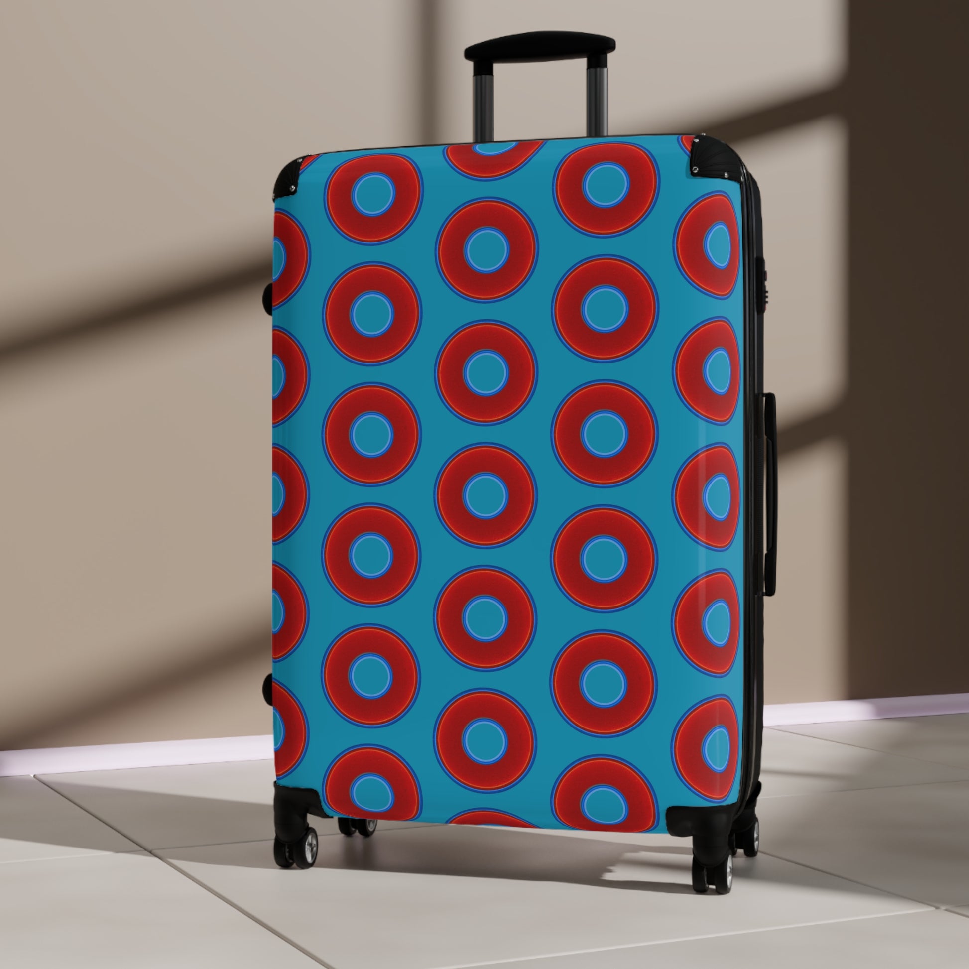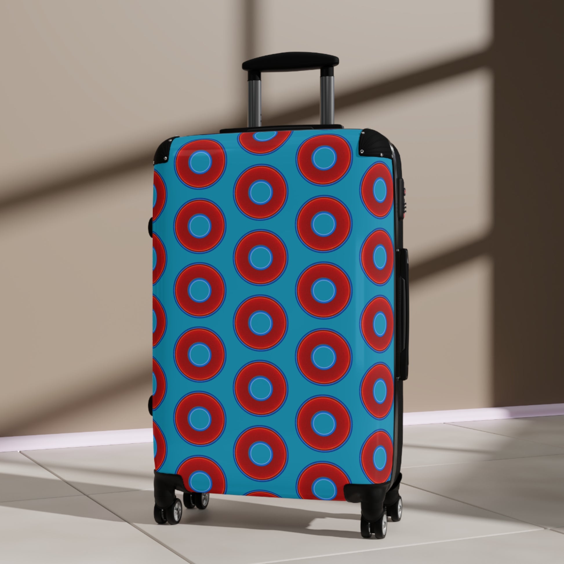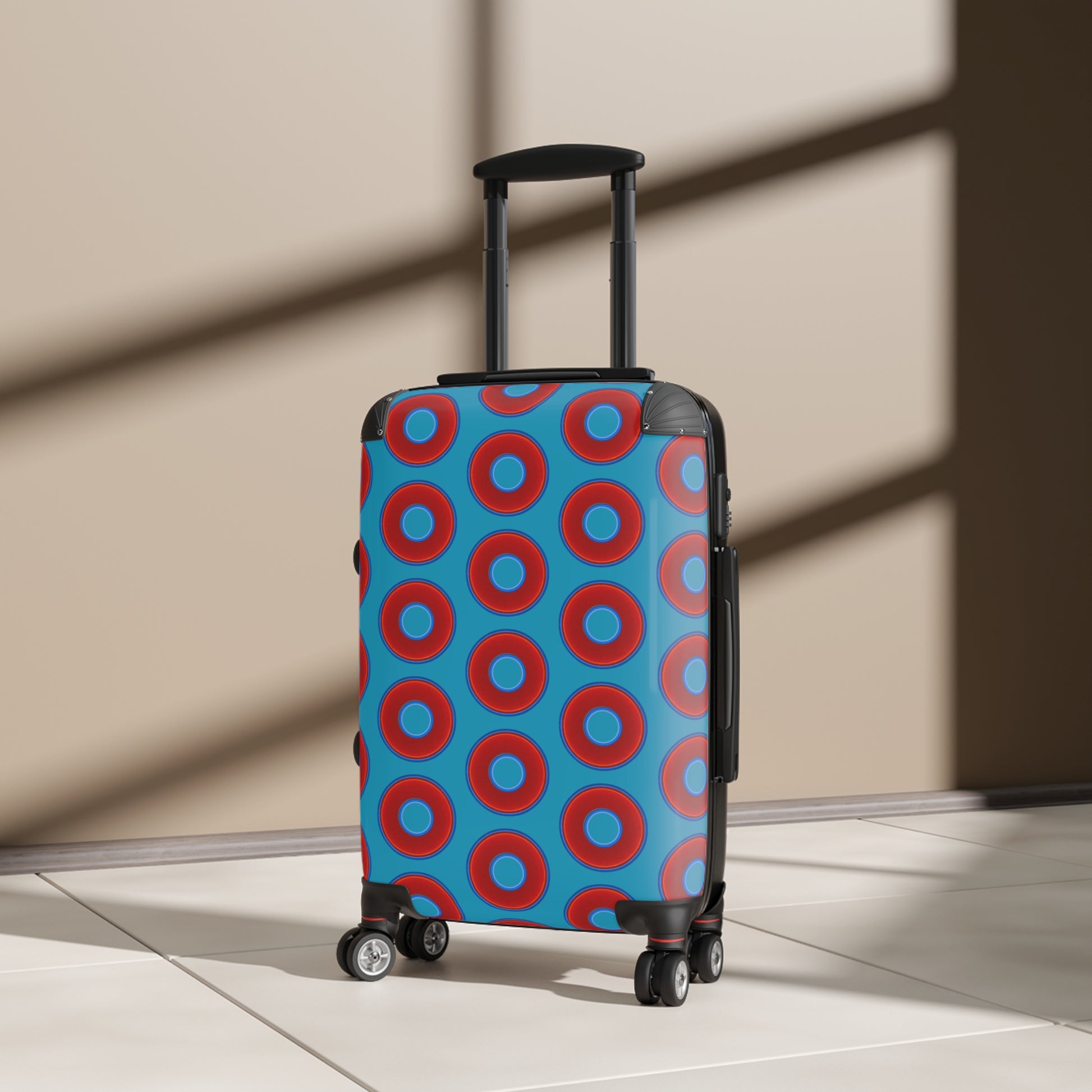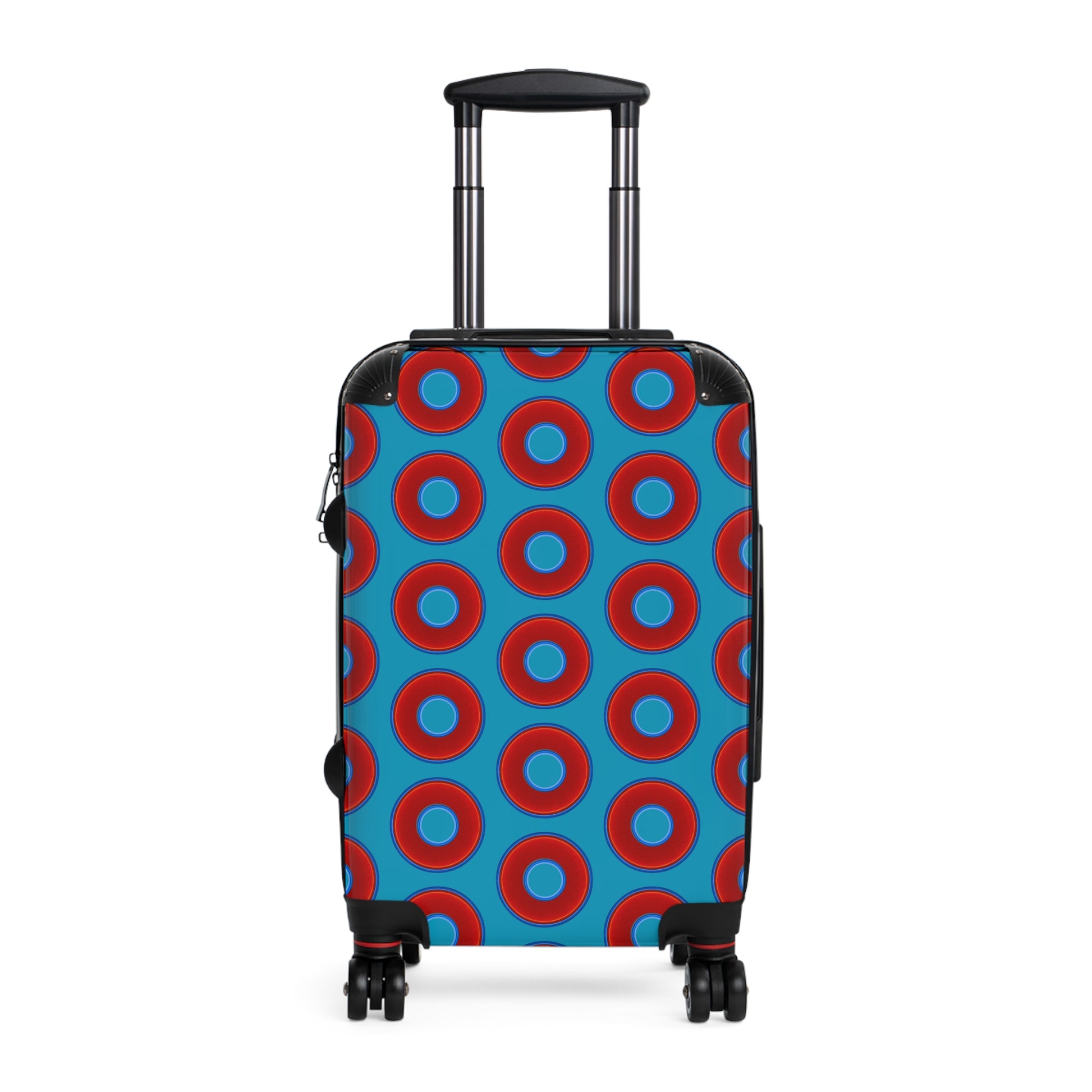 Very Lumpy Donut Suitcase series - your choice of S, M or L - vivid red donut print w/aquamarine blue background