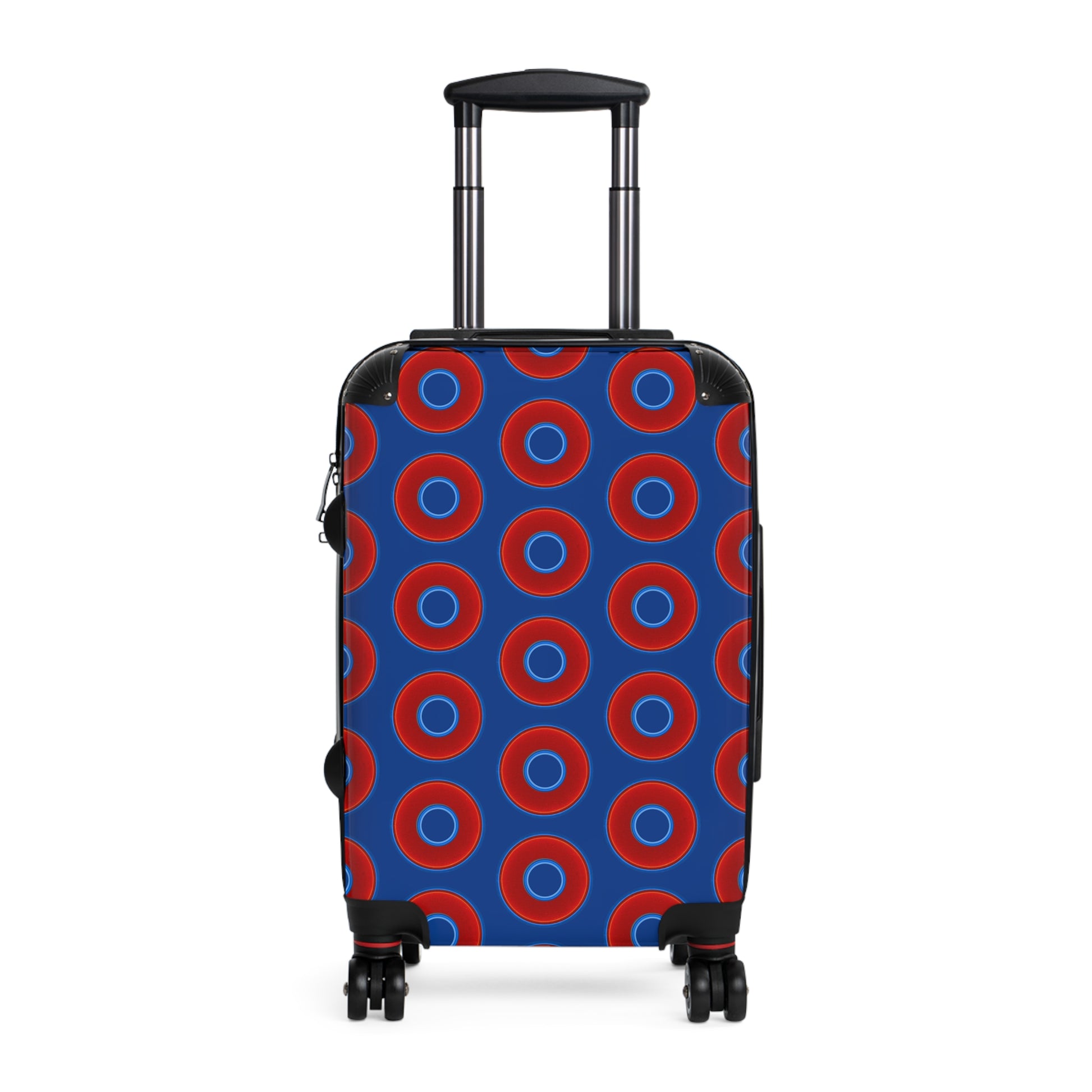 Very Lumpy Donut Suitcase series - your choice of S, M or L - vivid red donut print w/dark blue background
