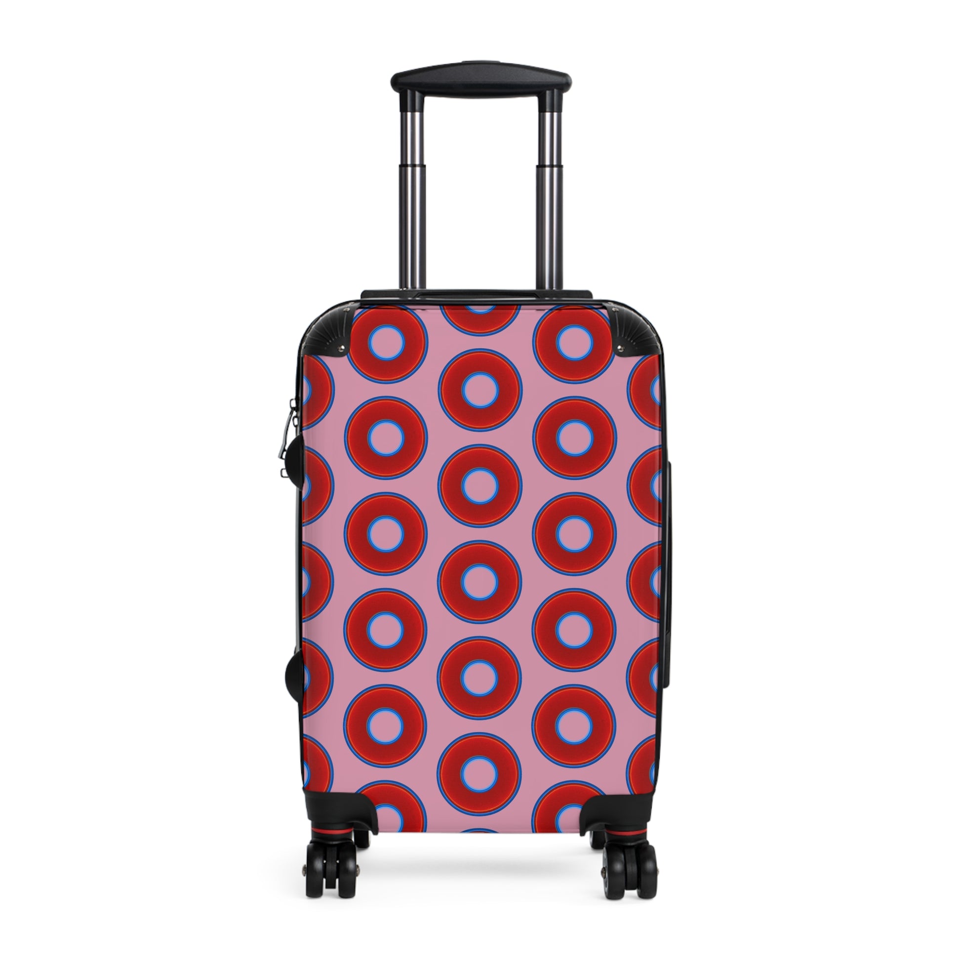 Very Lumpy Donut Suitcase series - your choice of S, M or L - vivid red donut print w/pale magenta background
