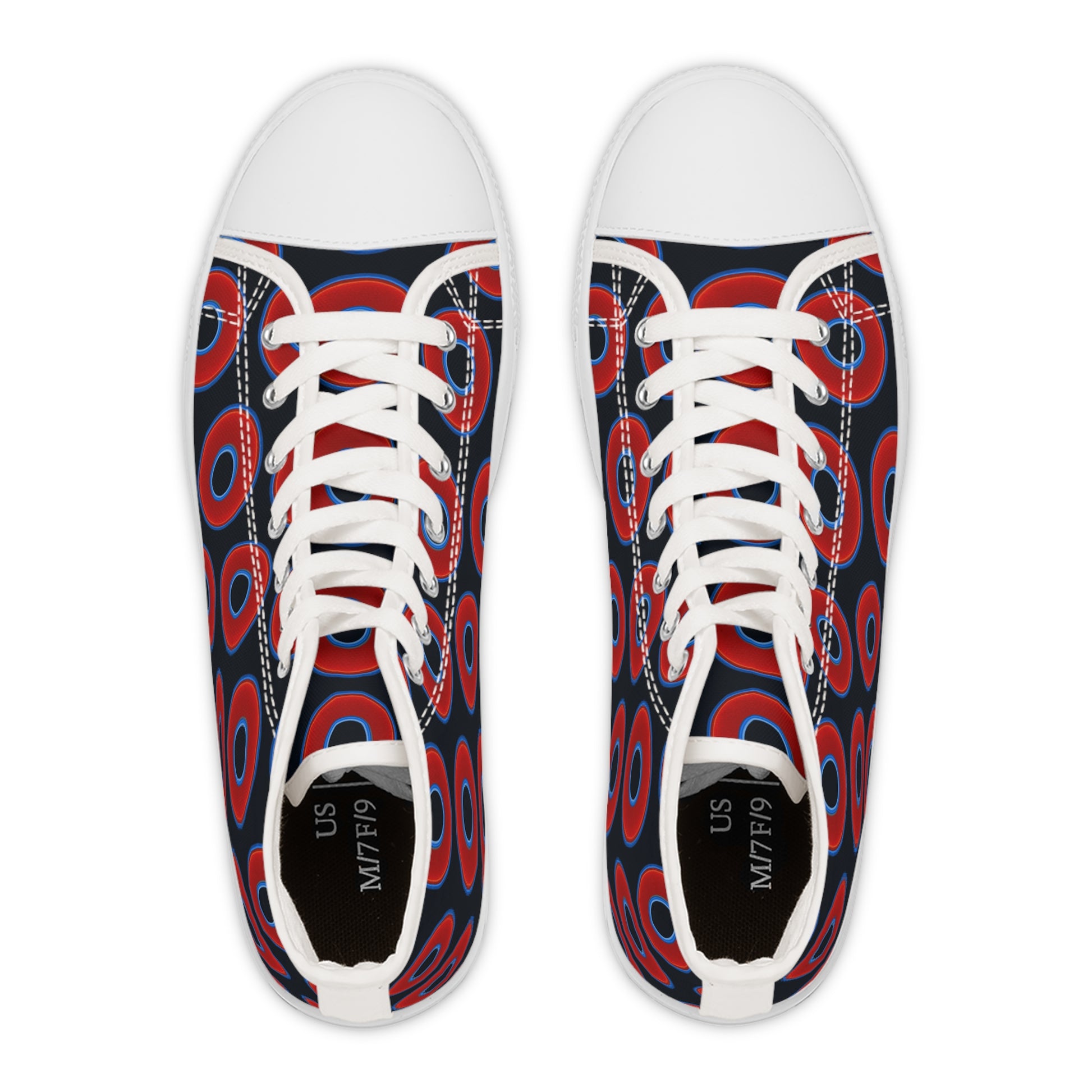 Women's High Top Chuck Taylors - large vivid red donut print w/blue charcoal background