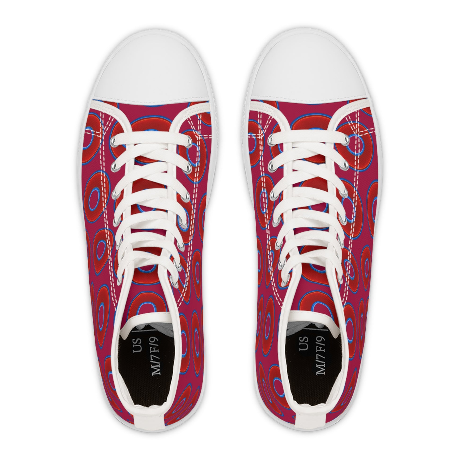 Women's High Top Chuck Taylors - large vivid red donut print w/dark magenta background