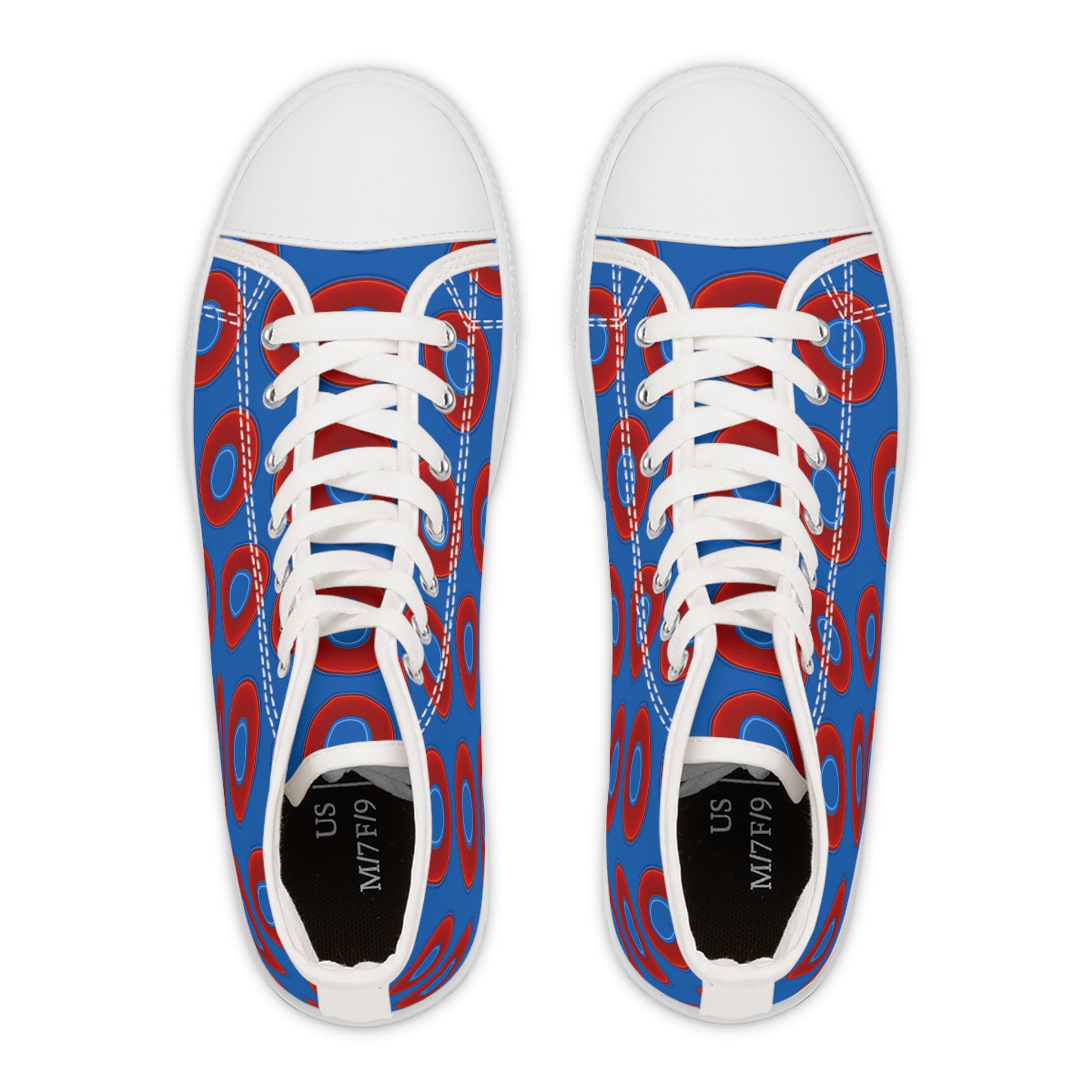 Women's High Top Chuck Taylors - large vivid red donut print w/dark royal blue background