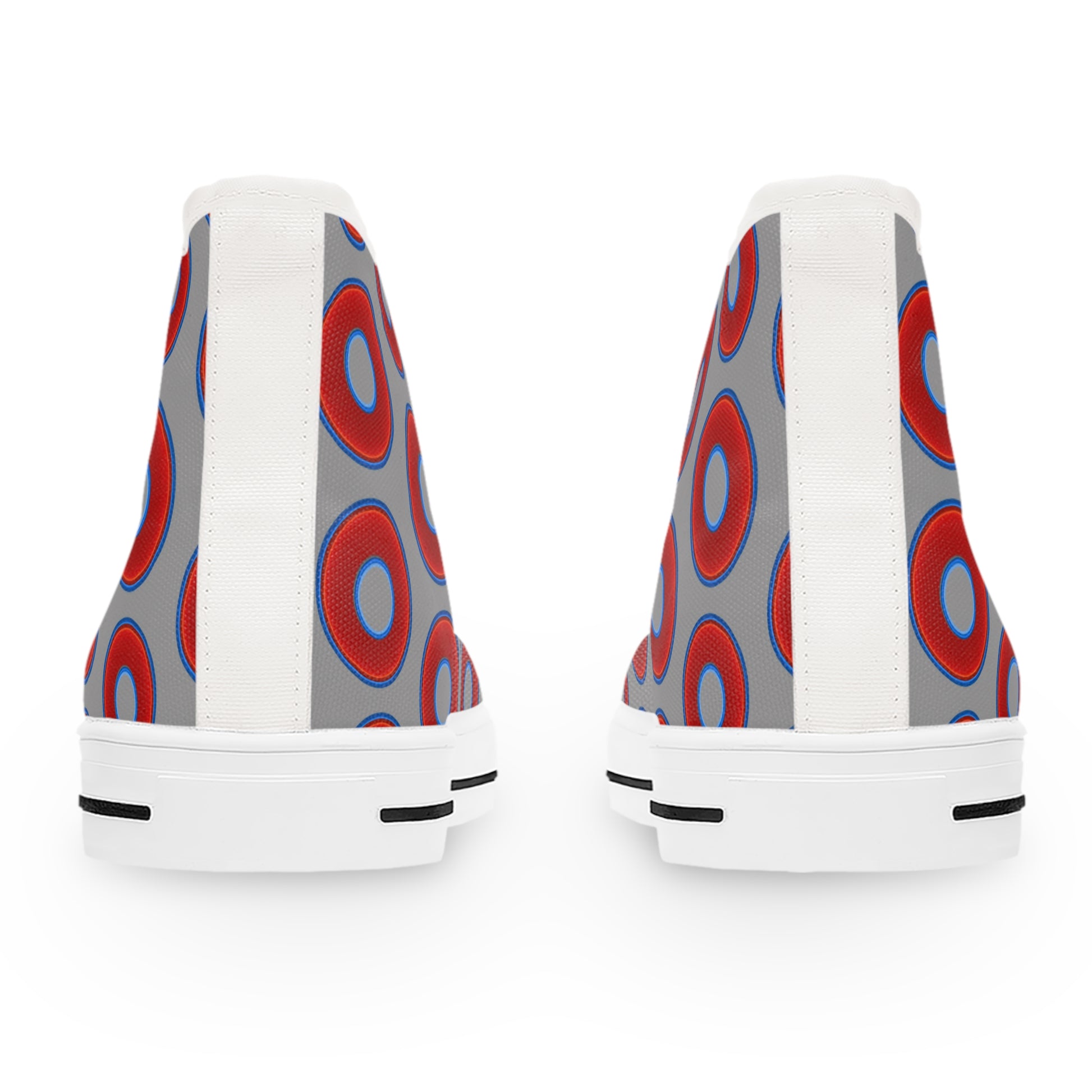 Women's High Top Chuck Taylors - large vivid red donut print w/gray background